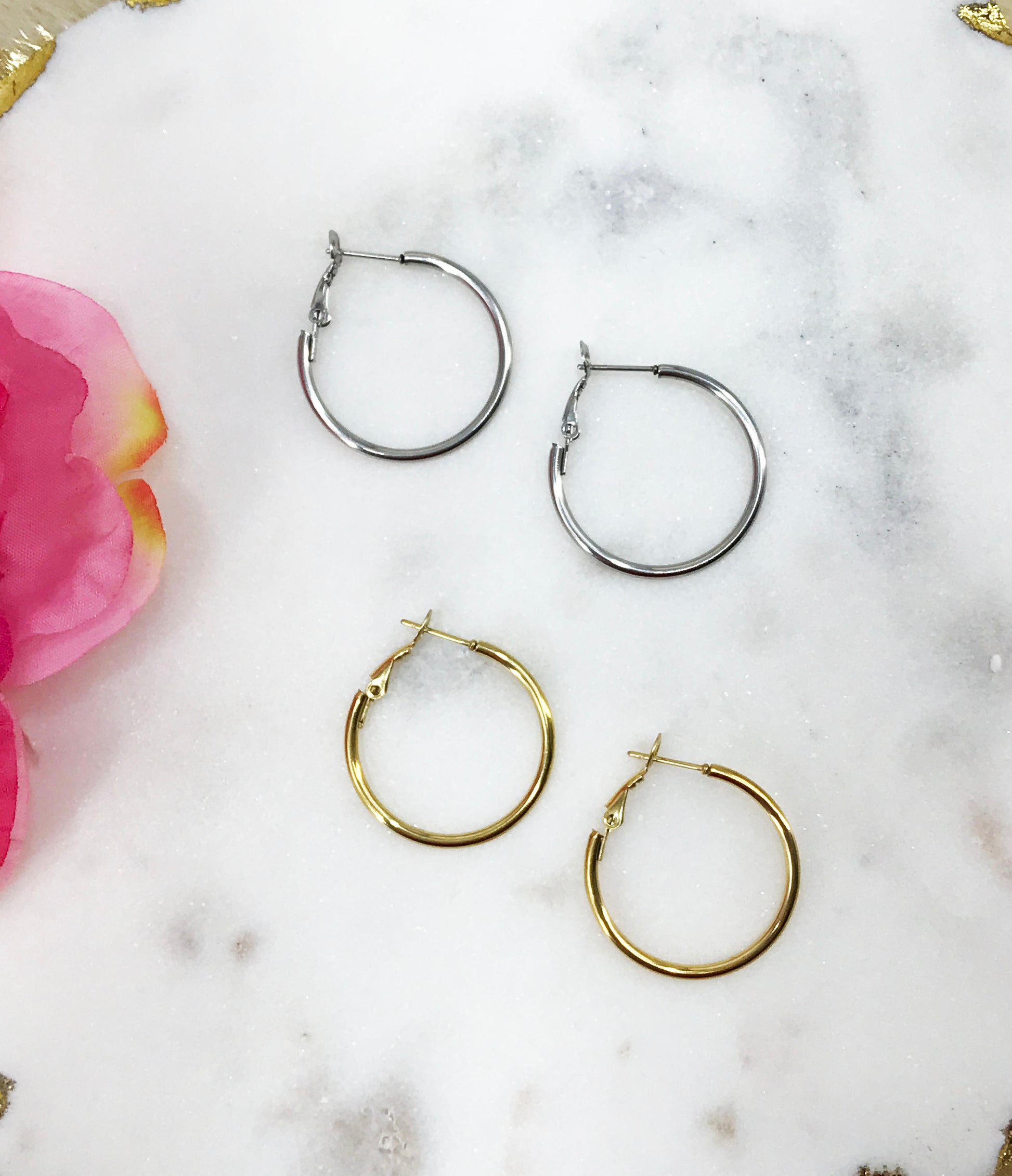 1" Silver & Gold Tone Stainless Steel Tarnish Resistant Small Hoop Earrings.