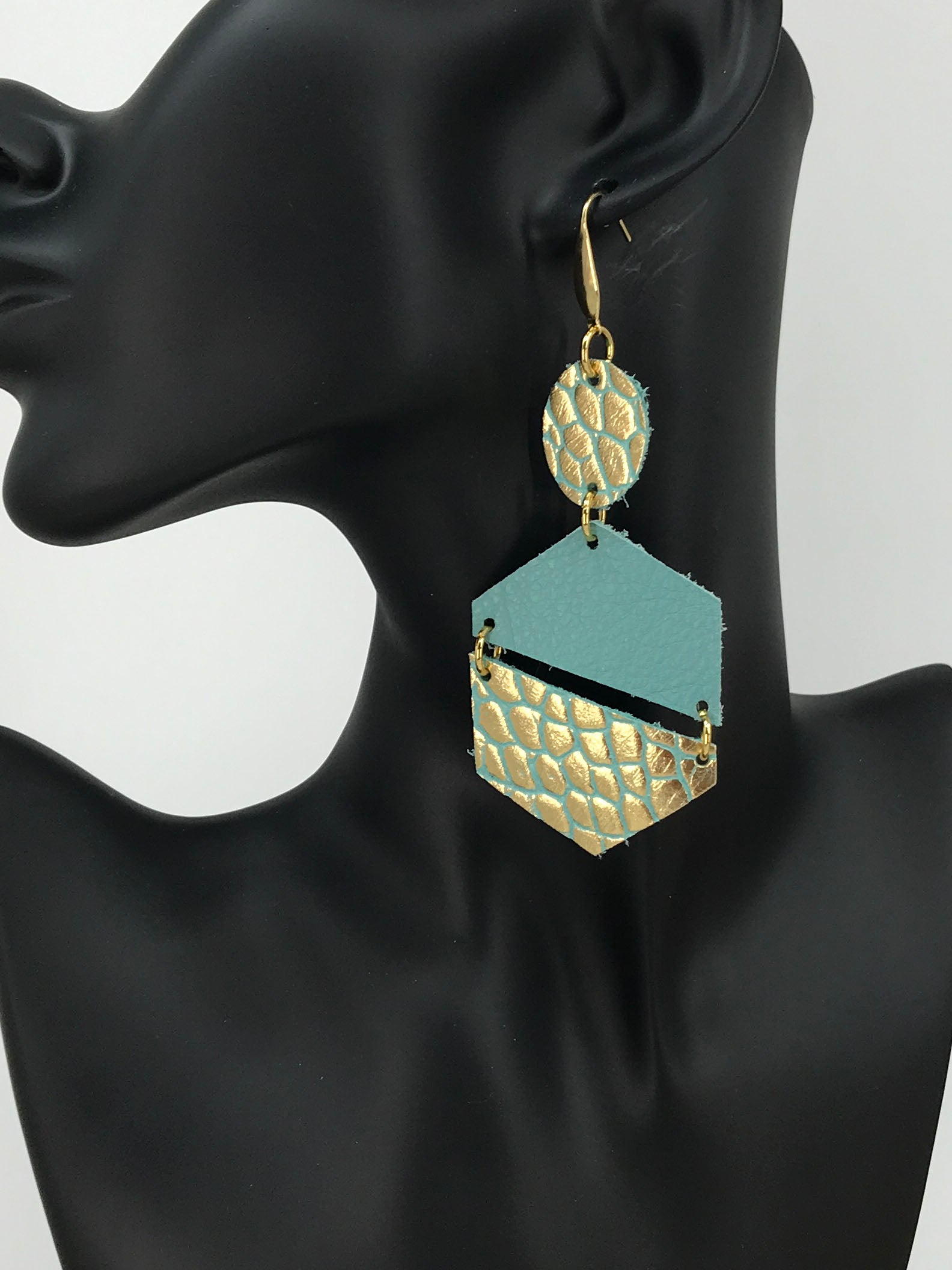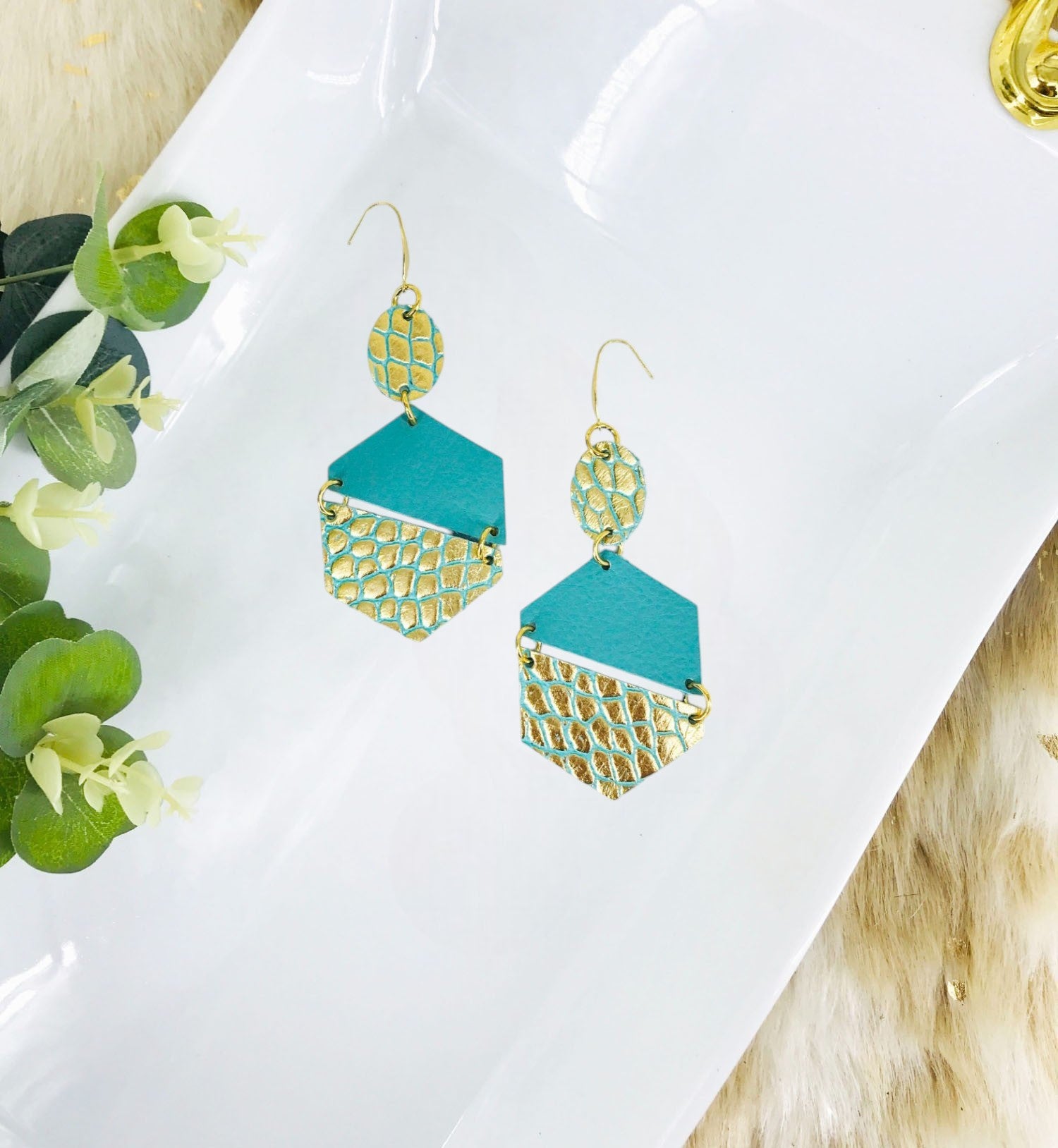 Aqua and Gold on Teal Genuine Leather Earrings - E19-1829
