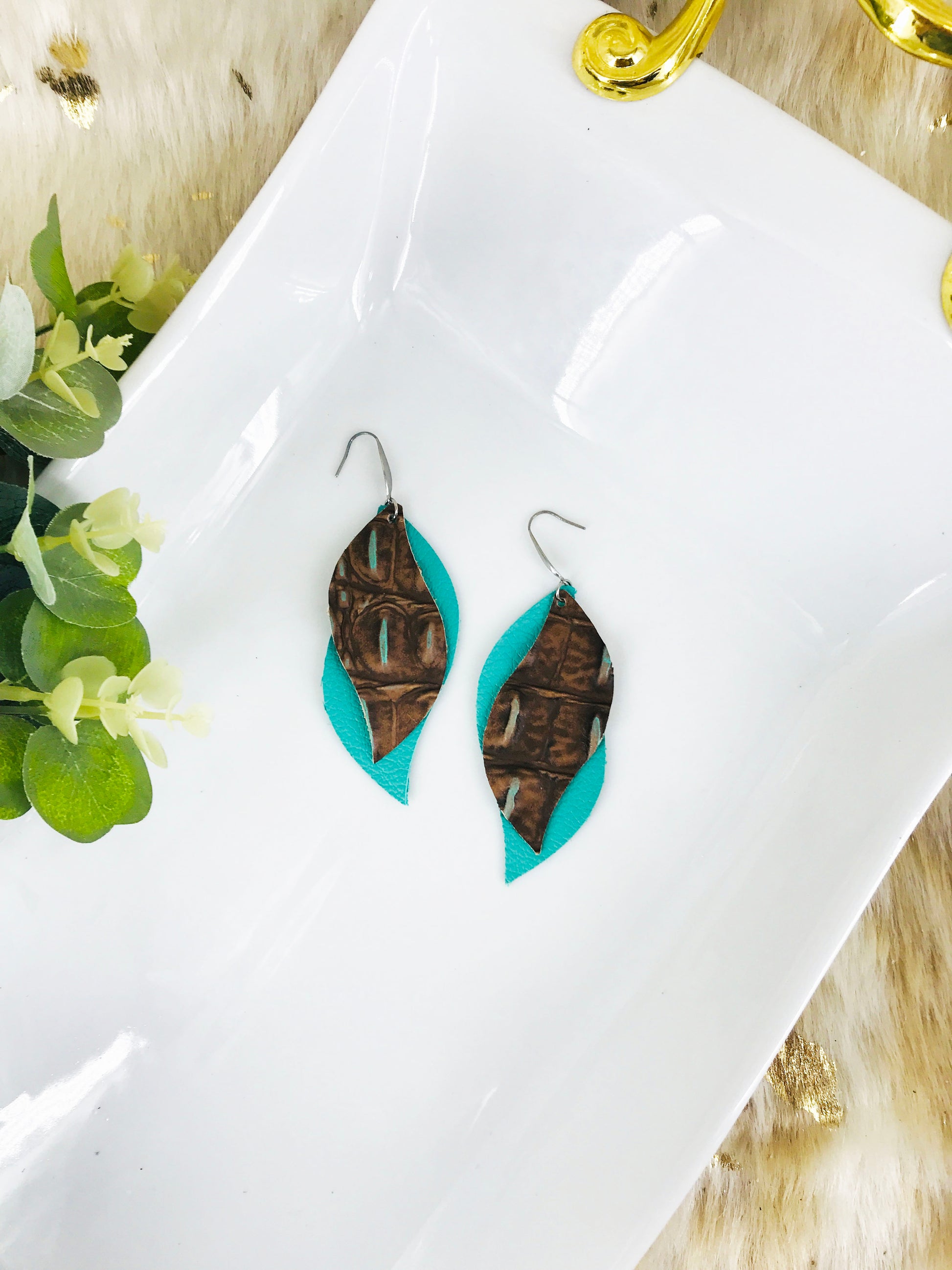 New Aqua Divine Leather and Cocoa Brown and Turquoise Crocodile Leather Earrings with Stainless Steel Findings and Ear Wires.