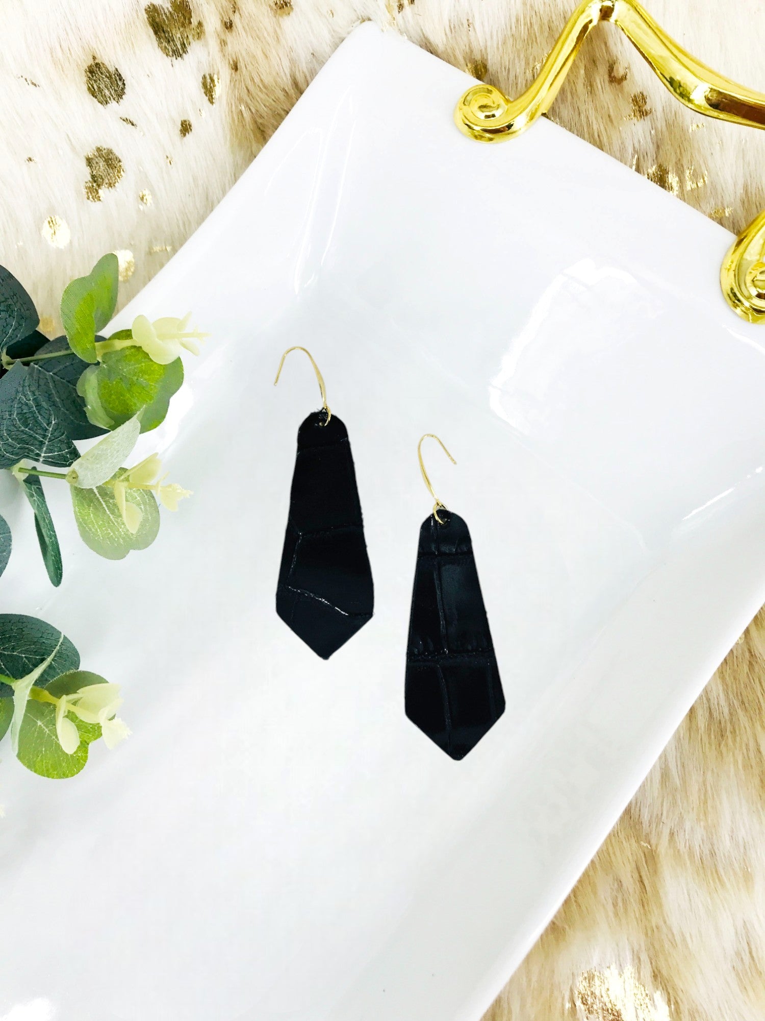 Black Alligator Leather Earrings with Gold Tone Stainless Steel Findings and Ear Wires.