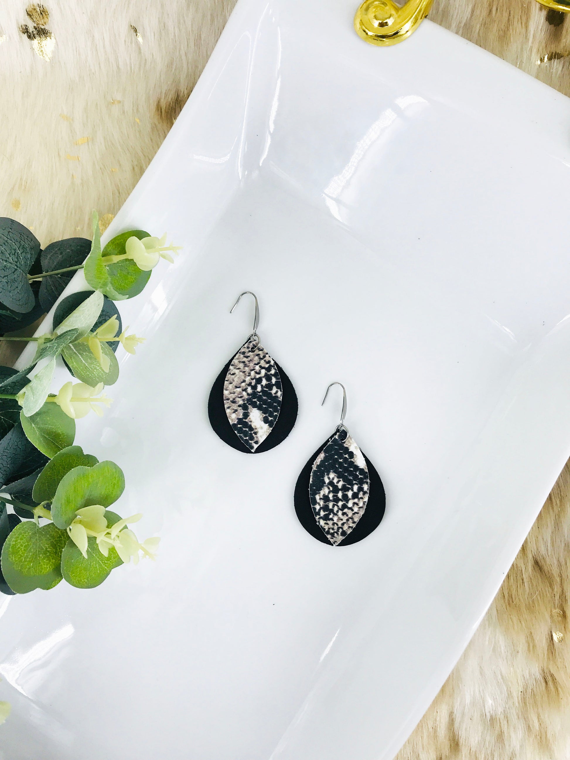 Black Genuine Leather and Natural Python Snake Leather Earrings with Stainless Steel Findings and Ear Wires.