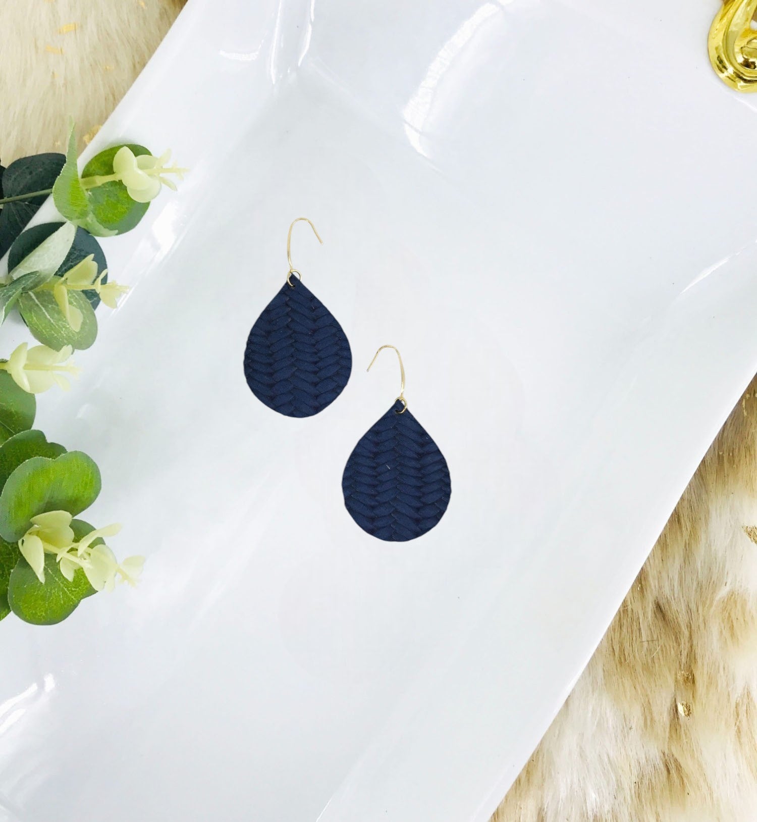 Blue Italian Fishtail Leather Earrings with Gold Tone Stainless Steel Findings and Ear Wires.