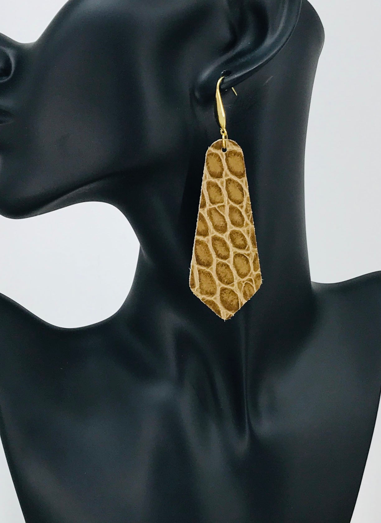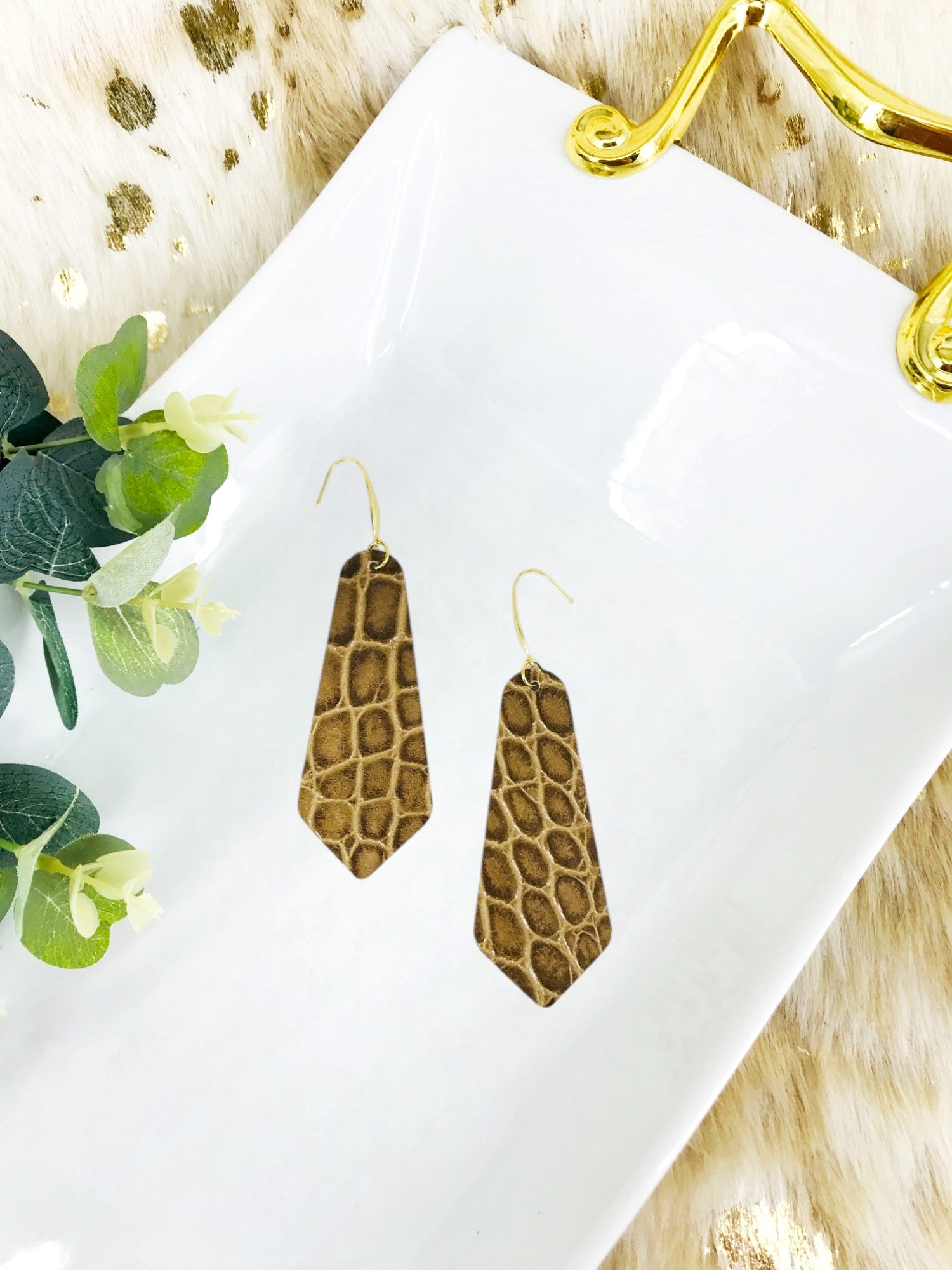 Brown Alligator Leather Earrings with Gold Tone Stainless Steel Findings and Ear Wires.