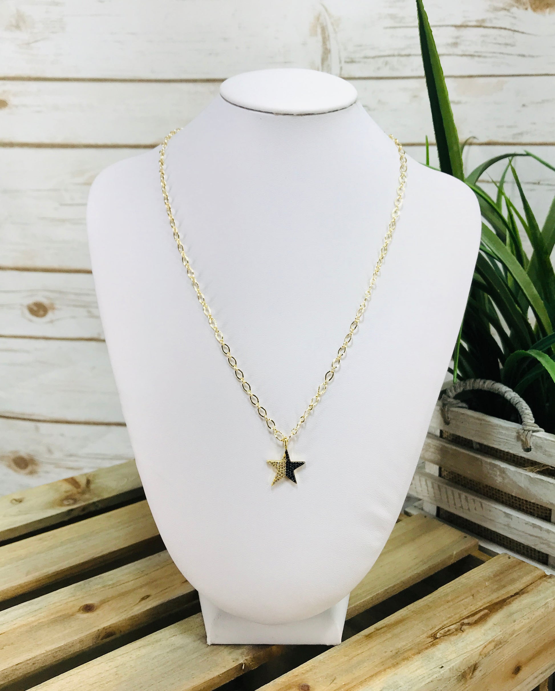 18" Gold Tone 14K Chain with Clear & Black Pave Star Pendant Necklace.