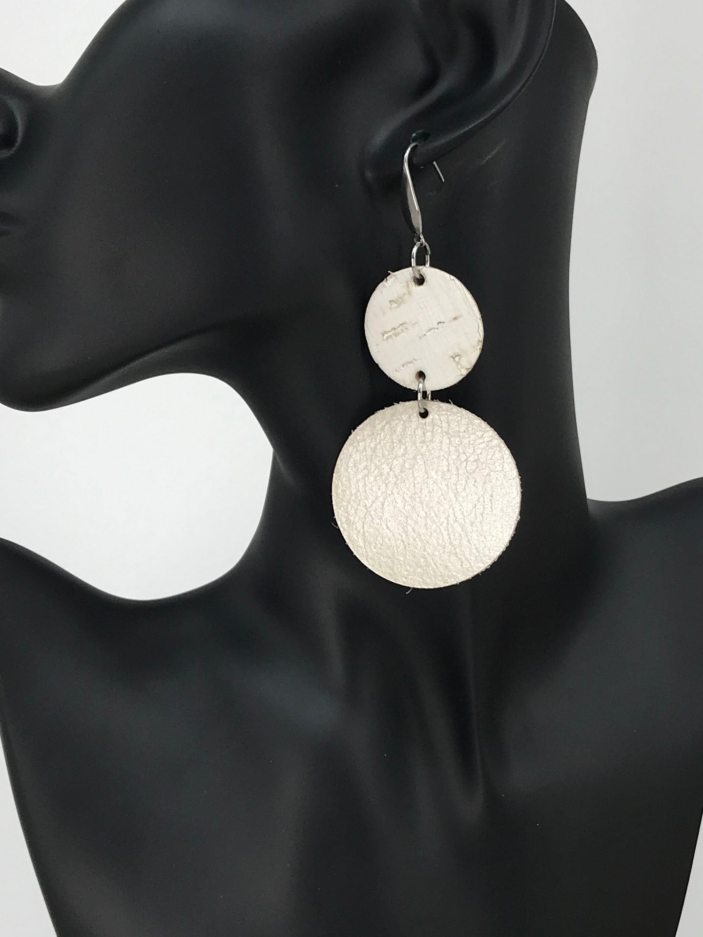 Champagne Soft and Shiny Pearlized Smooth Leather and Off White Birch Cork Leather Earrings with Stainless Steel Findings and Ear Wires.