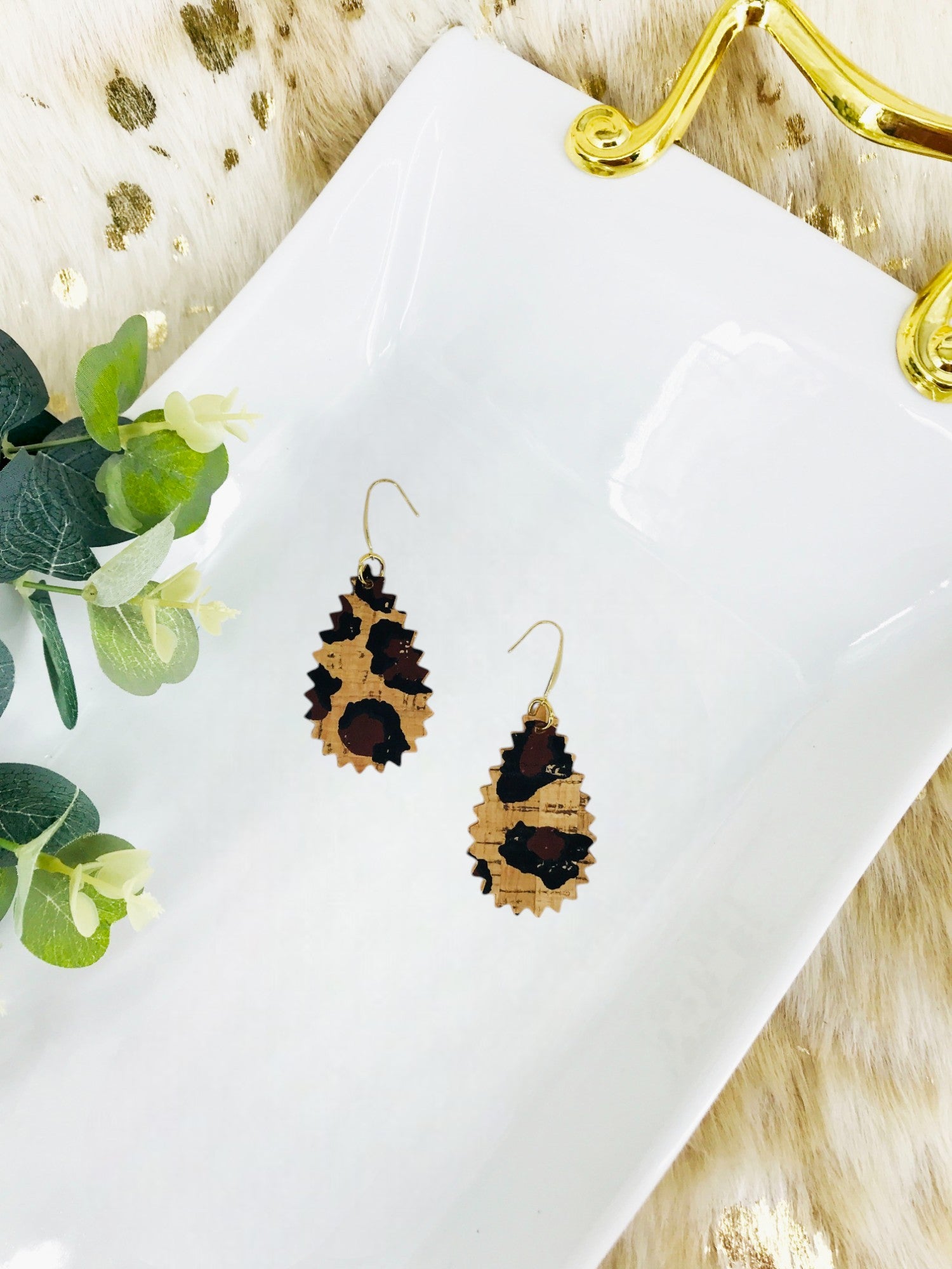 Double Sided Chocolate Leopard Cork Earrings with Gold Tone Stainless Steel Findings and Ear Wires.