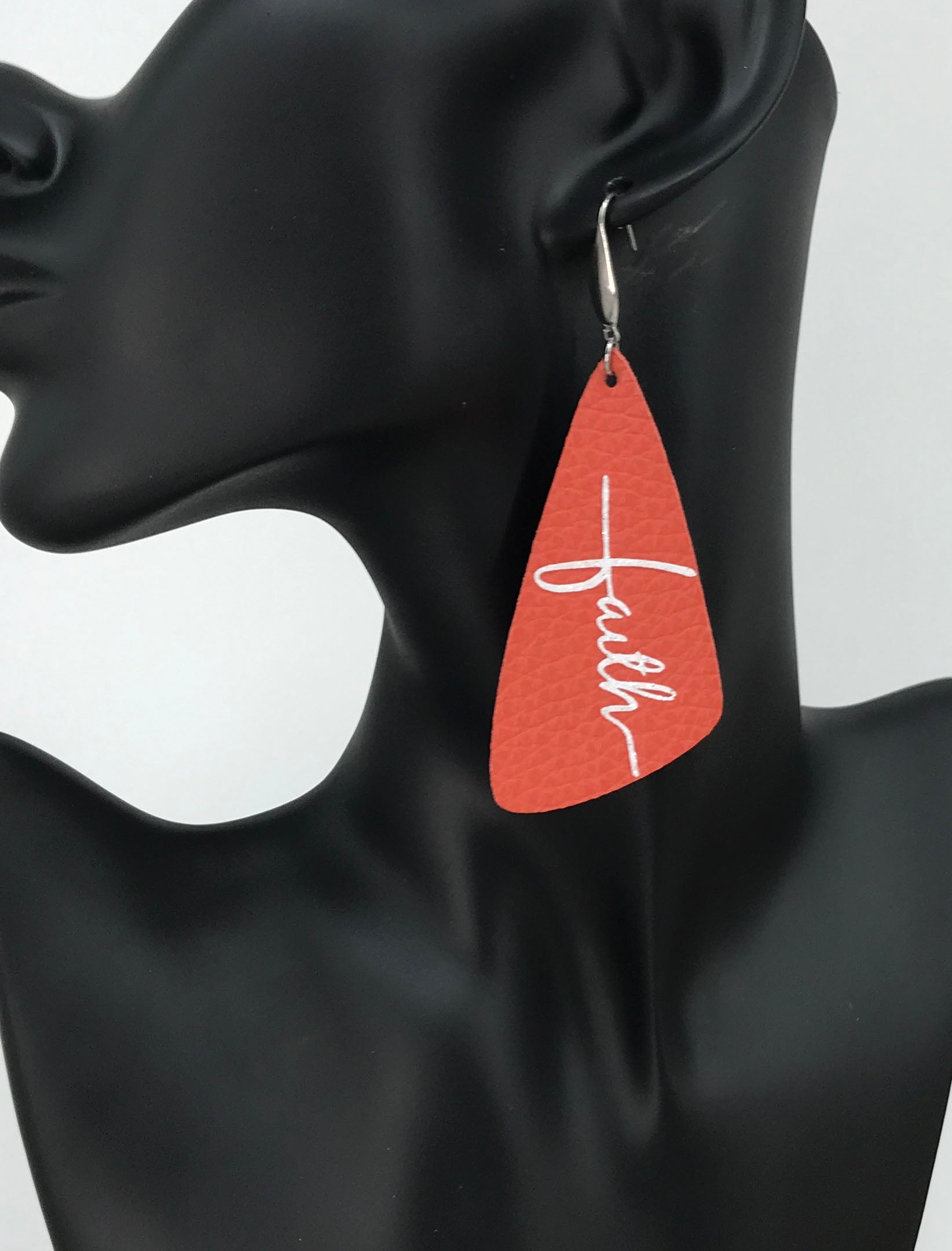 Dark Coral Imperial Leather and White Glitter "Faith" Earrings with Stainless Steel Findings and Ear Wires.
