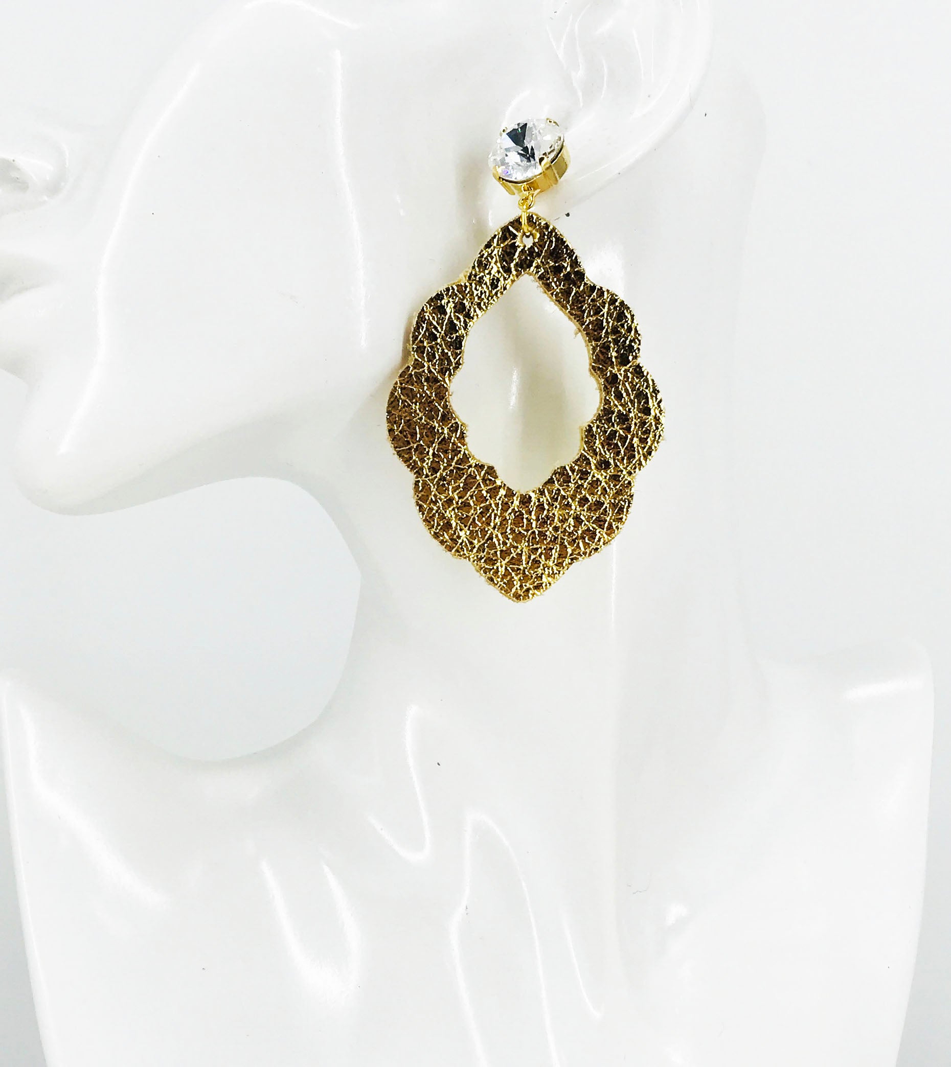 Our Signature Crystal and Leather Earrings but Double Sided for Firmness. Cushion Cut Crystal Clear Crystals Mounted in a Gold Tone 4 Prong Stud above Double Sided Pebbled Metallic Gold Leather.