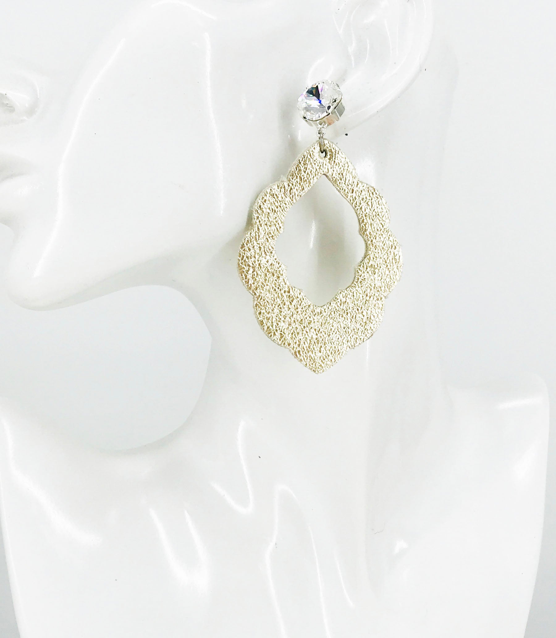 Our Signature Genuine Crystal and Leather Earrings but in Platinum and Double Sided for Firmness. Cushion Cut Crystal Clear Crystals Mounted in a Silver Tone 4 Prong Stud above Double Sided Pebbled Platinum Leather.