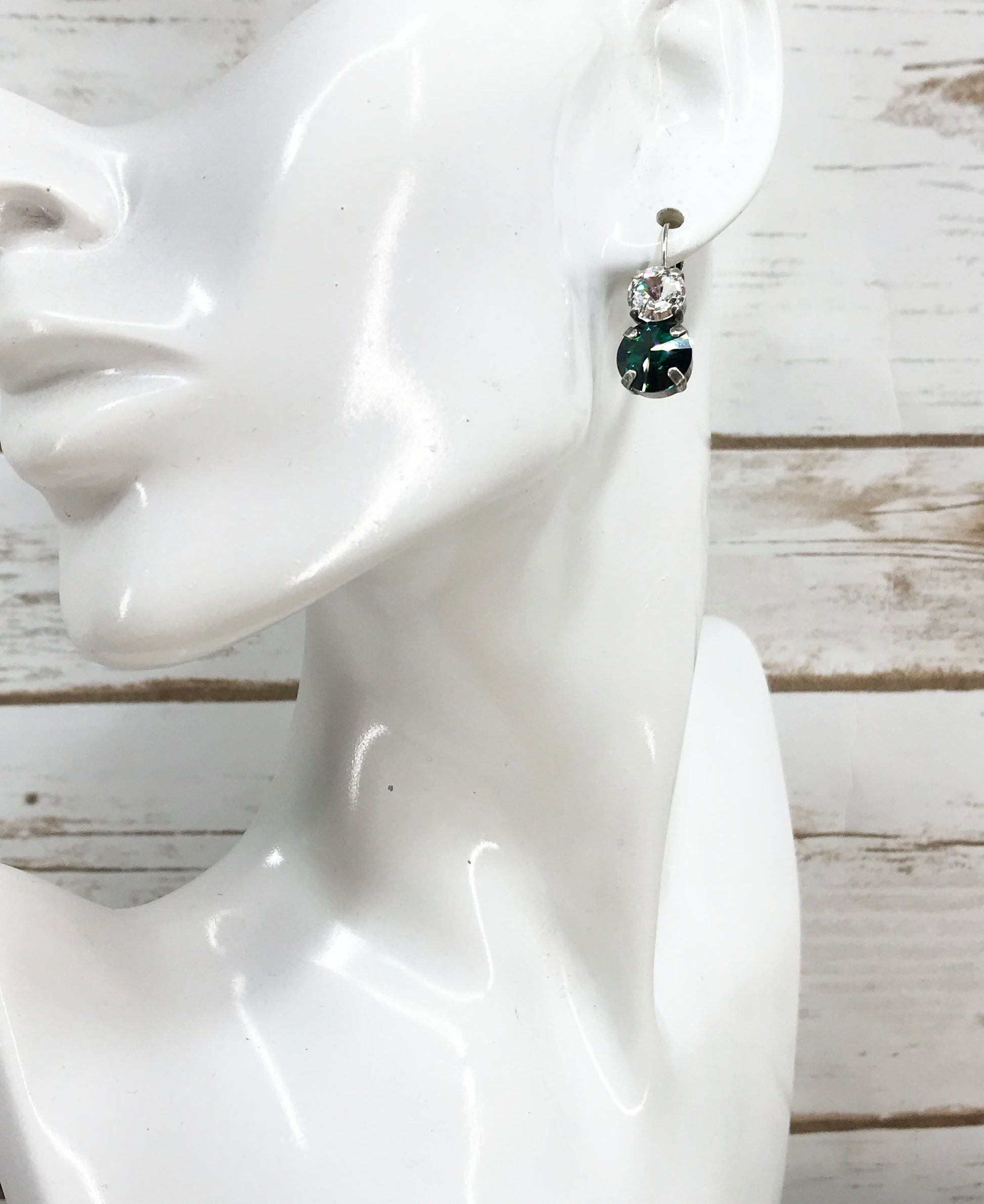 Crystal Clear & Emerald Genuine Crystal Earrings in an Antique Silver 4 Prong Lever Back Setting.