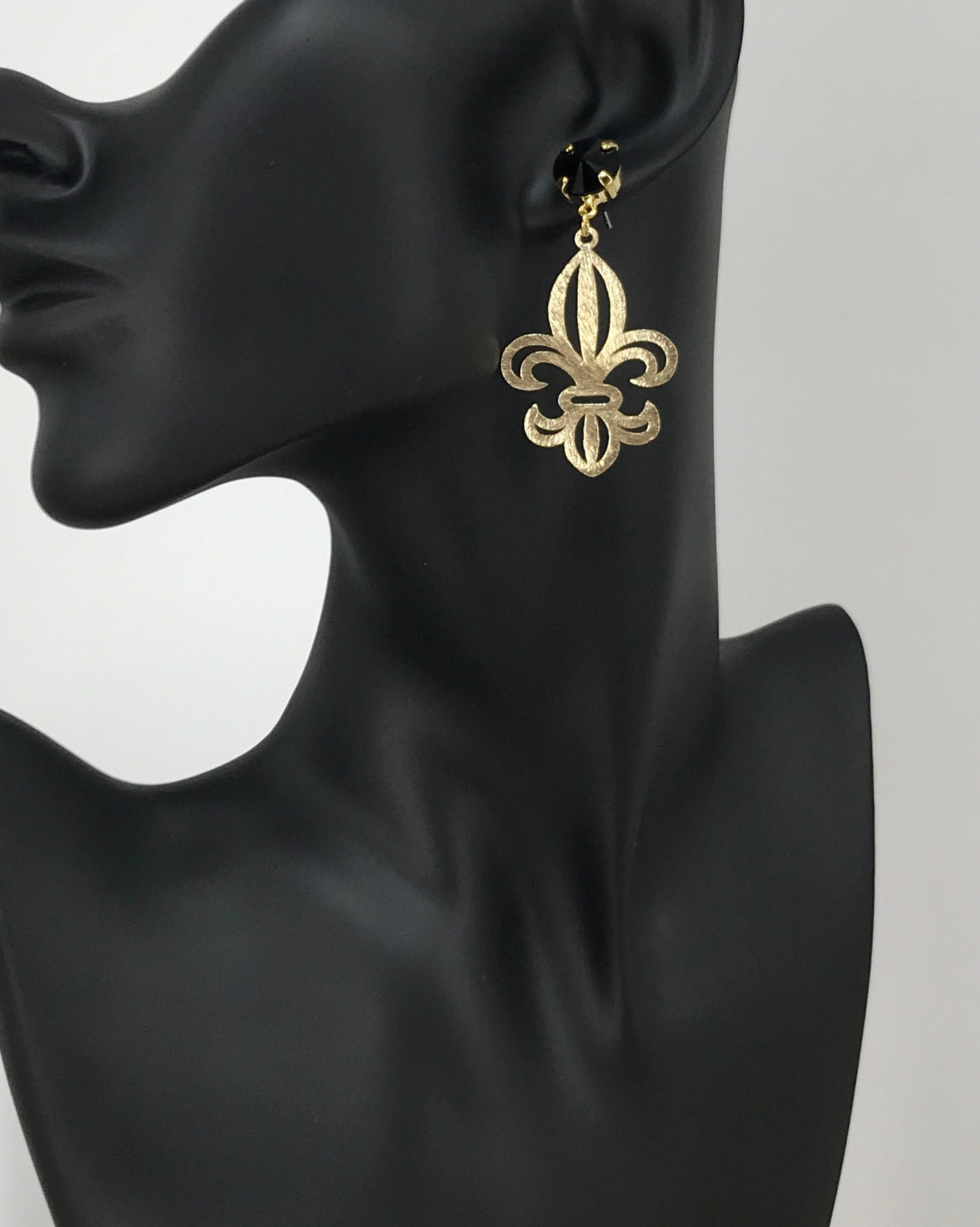 Jet Rivoli Swarovski Crystal and Brushed Gold Fleur De Lis Pendant Stud Earrings.
