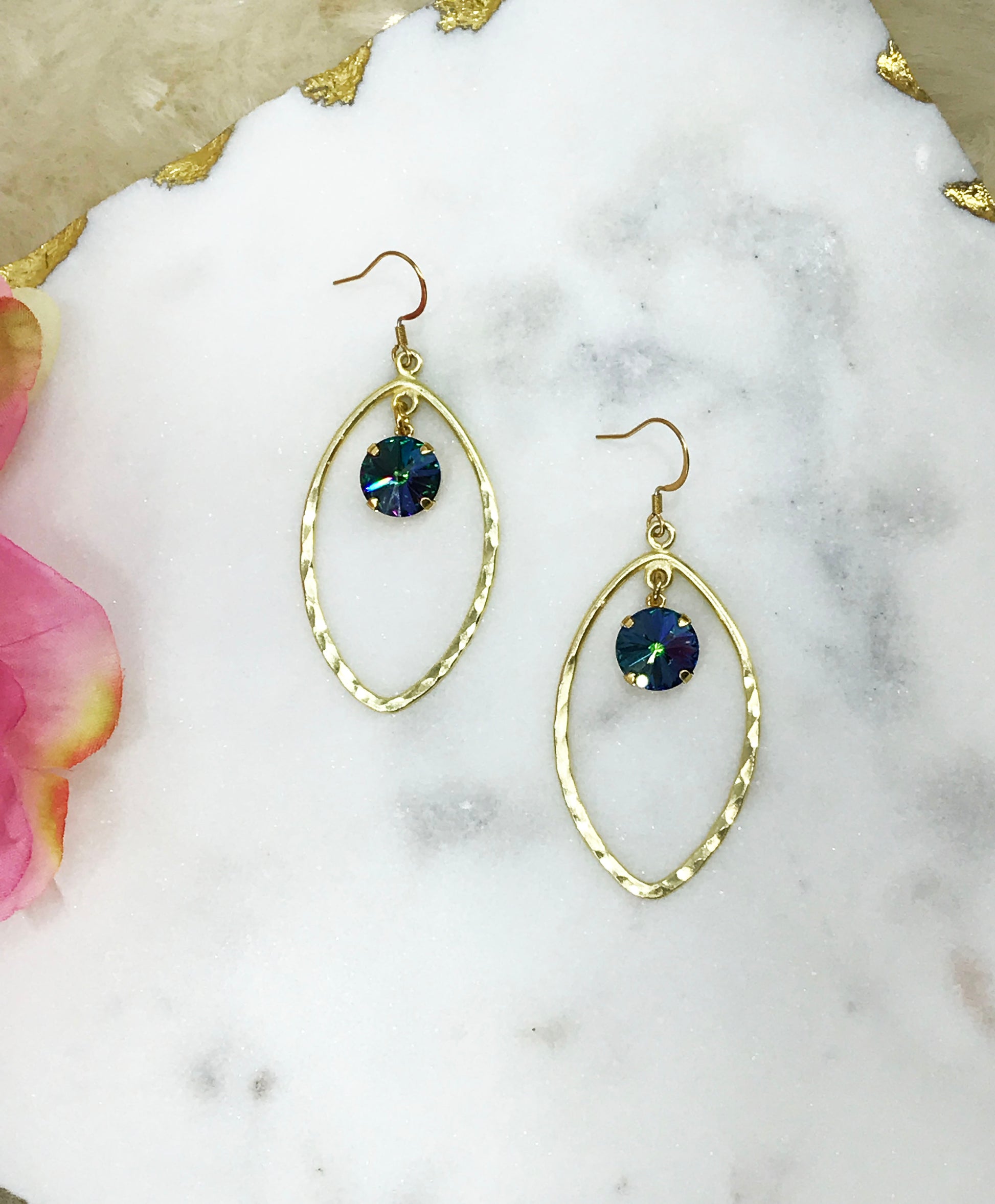 Rivoli Cut Electra Genuine Crystals in a Gold Tone 4 Prong Pendant Setting on Gold Hammered Marquise Pendant with Gold Tone Stainless Steel Fish Hook Ear Wires.