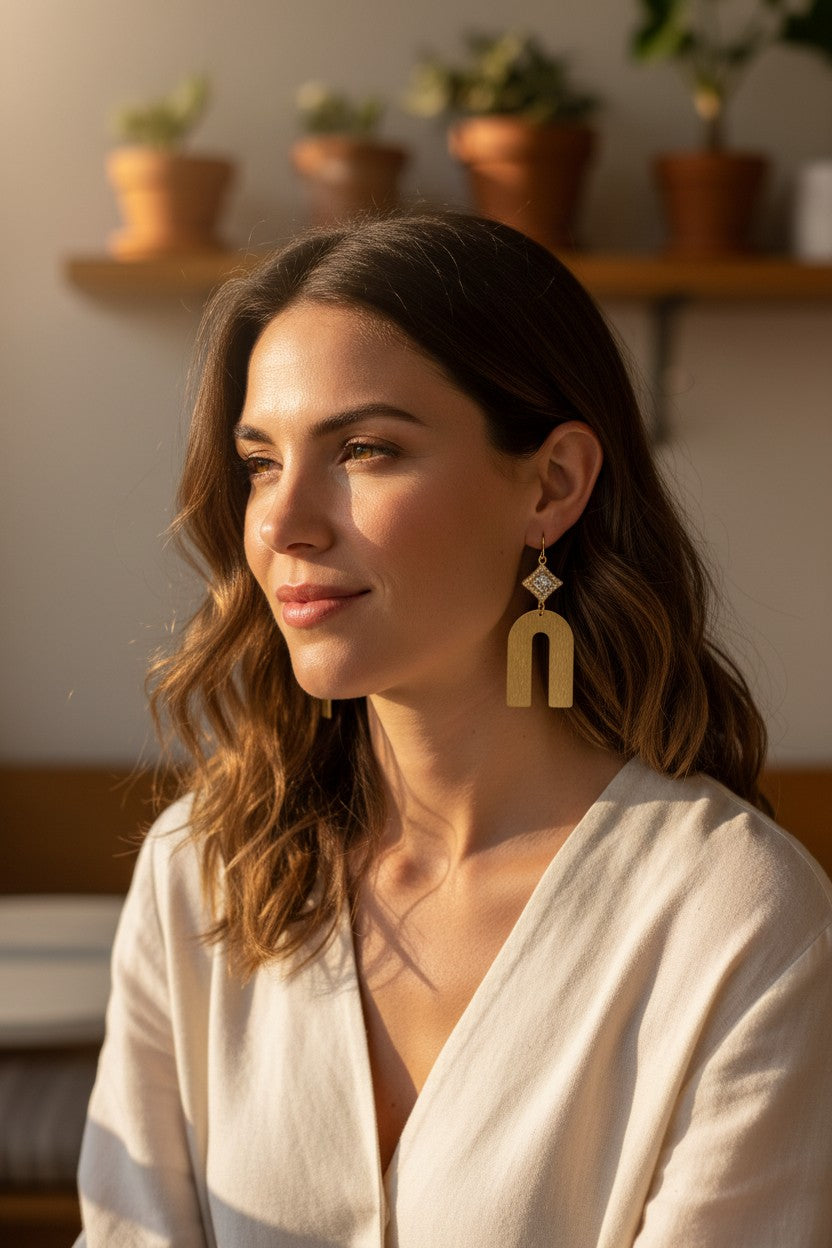 CZ & Brushed Gold Pendant Earrings on Gold Tone Stainless Steel Fish Hook Ear Wires.