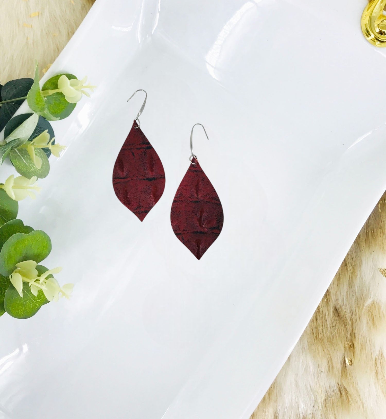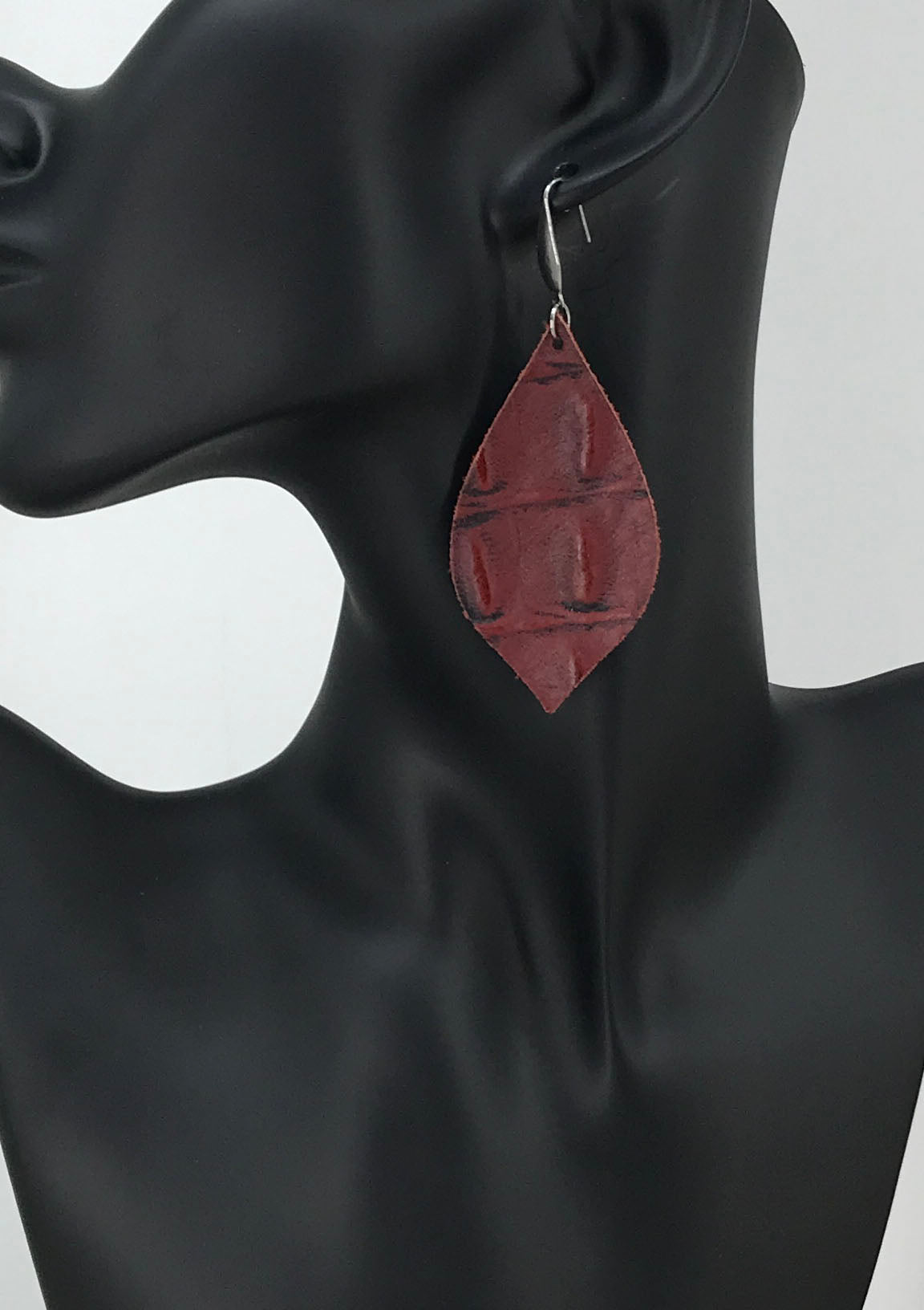 Dark Red Cranberry Alligator Leather Earrings with Stainless Steel Findings and Ear Wires.
