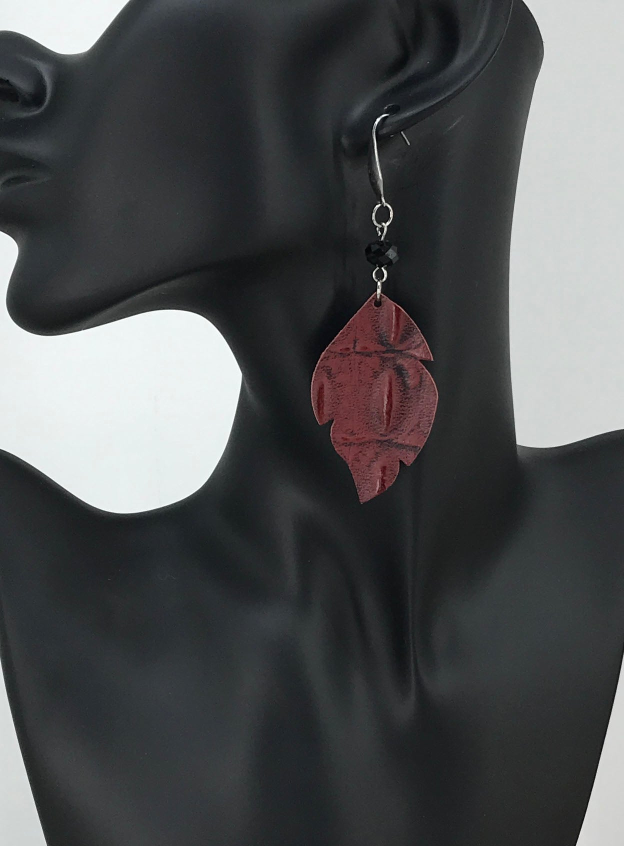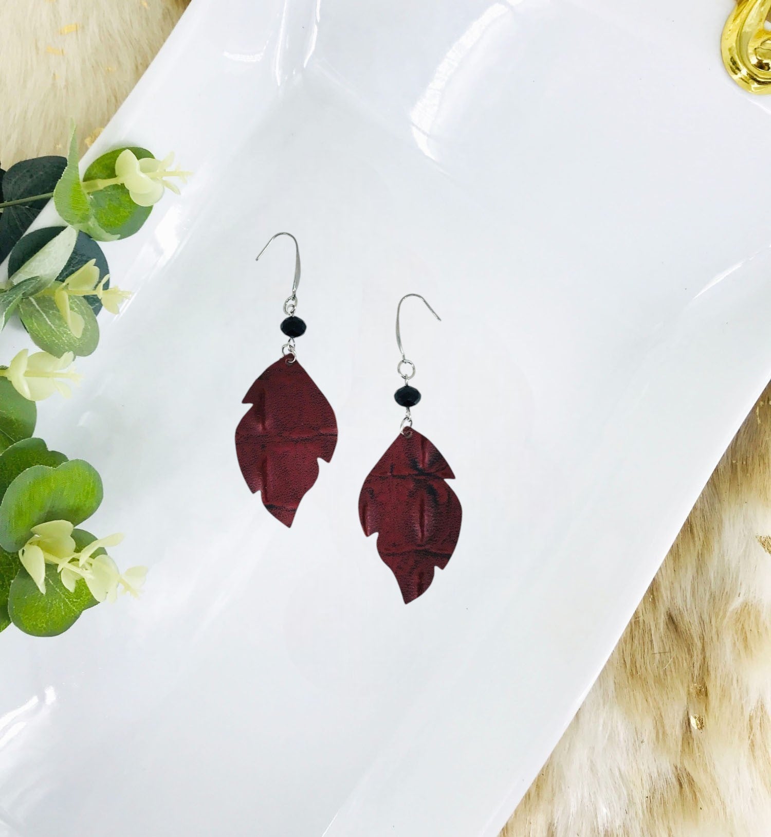 Dark Red Cranberry Alligator Leather Earrings with Stainless Steel Findings and Ear Wires.