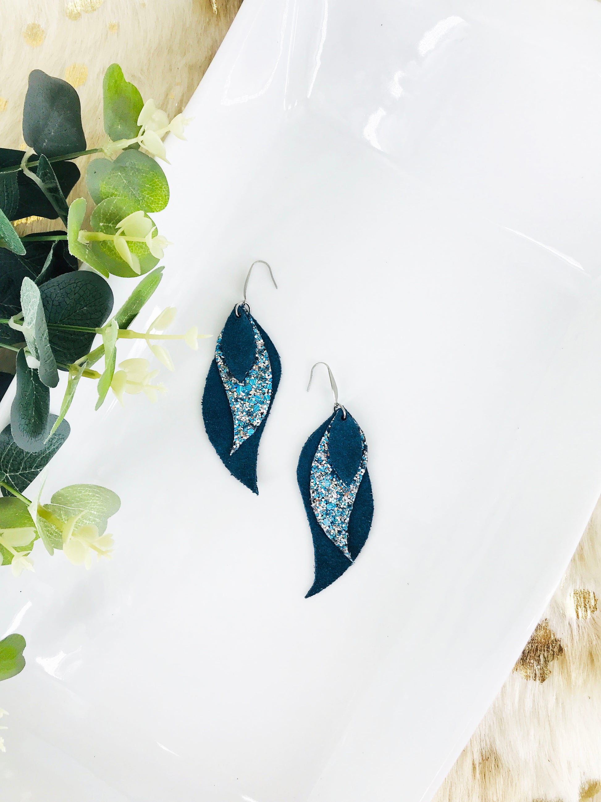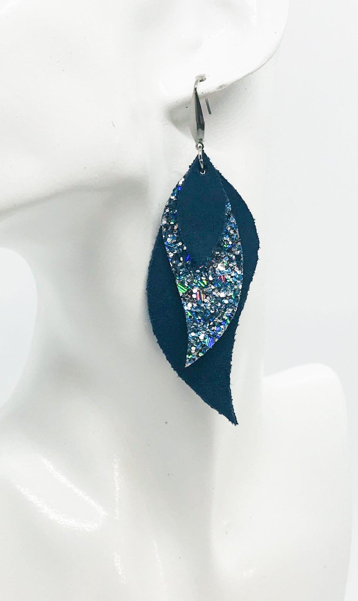 Dark Teal Leather and Turquoise Glitter Earrings - E19-453