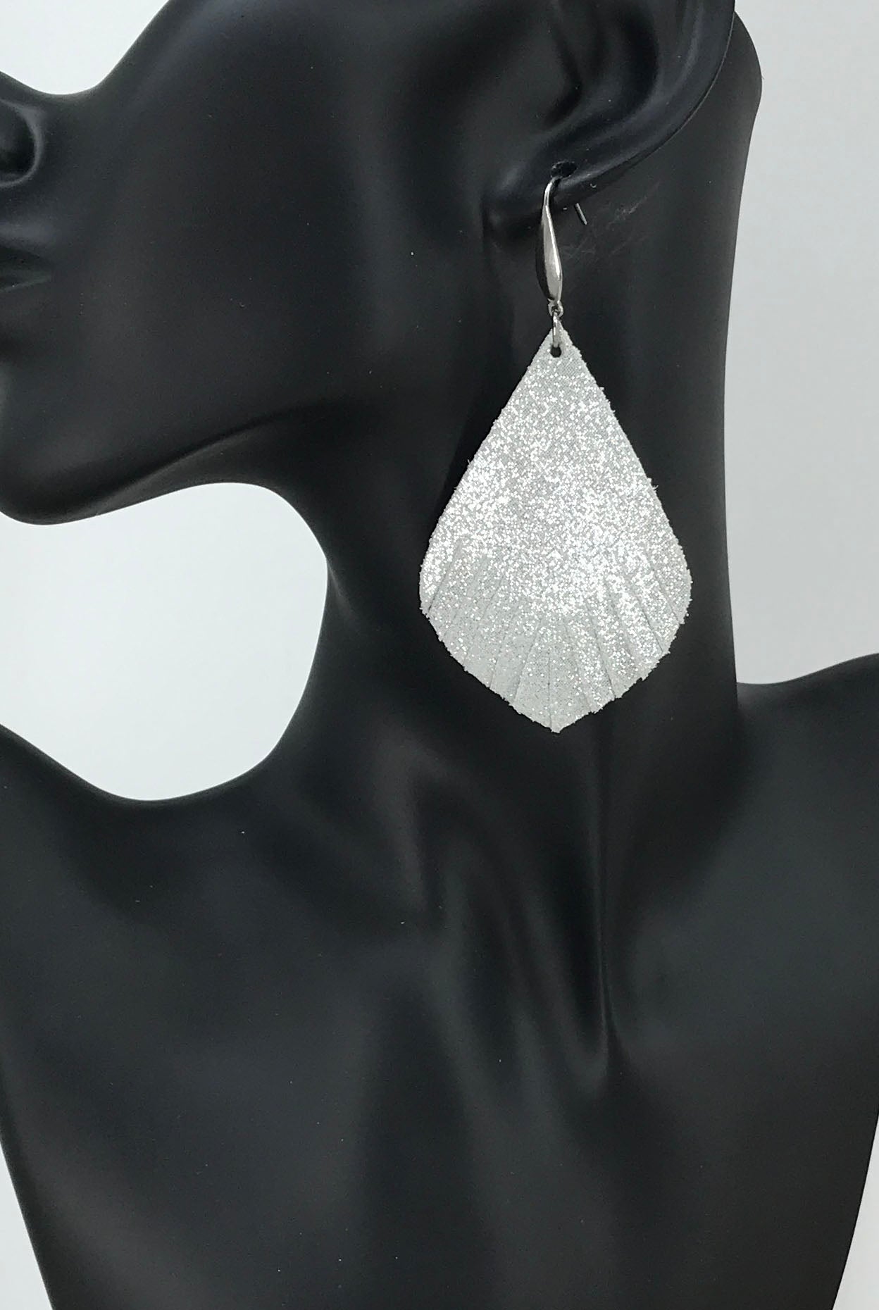 Dazzle Silver on White Pearl Leather Earrings with Stainless Steel Findings and Ear Wires.