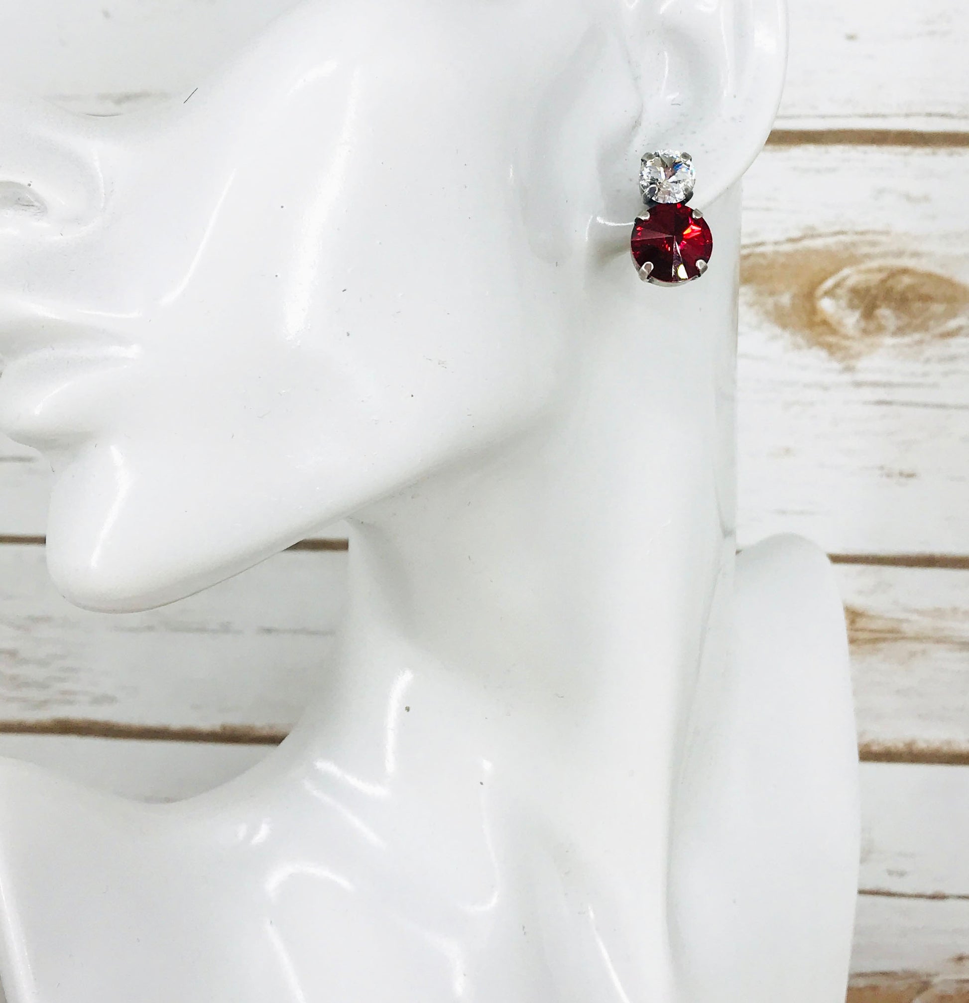 Clear and Scarlet Rivoli Cut Genuine Crystal Earrings in an Antique Silver Stud Setting.