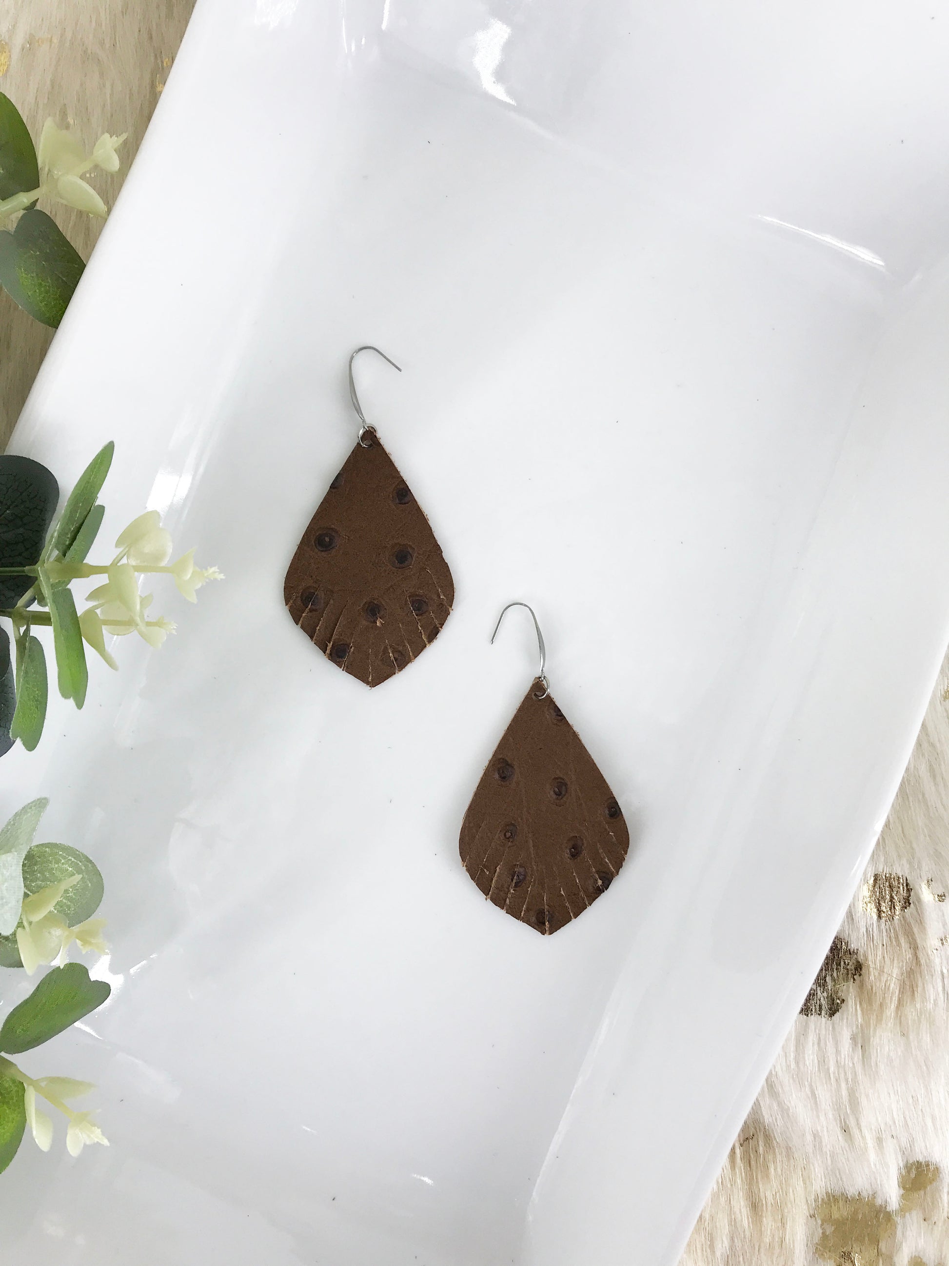 Dirty Brown Embossed Ostrich Leather Earrings with Stainless Steel Findings and Ear Wires.