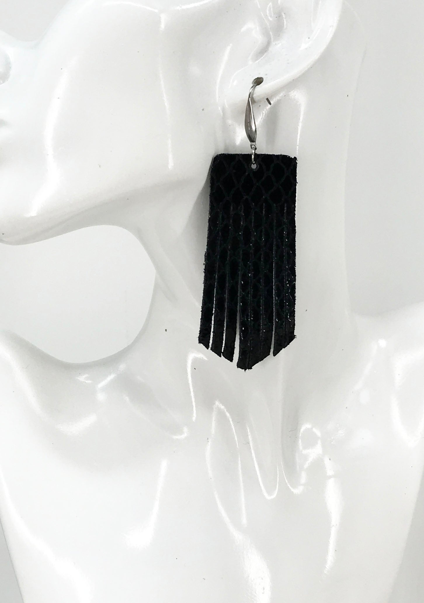 Fish Net Pattern Black Leather Earrings with Stainless Steel Findings and Ear Wires.