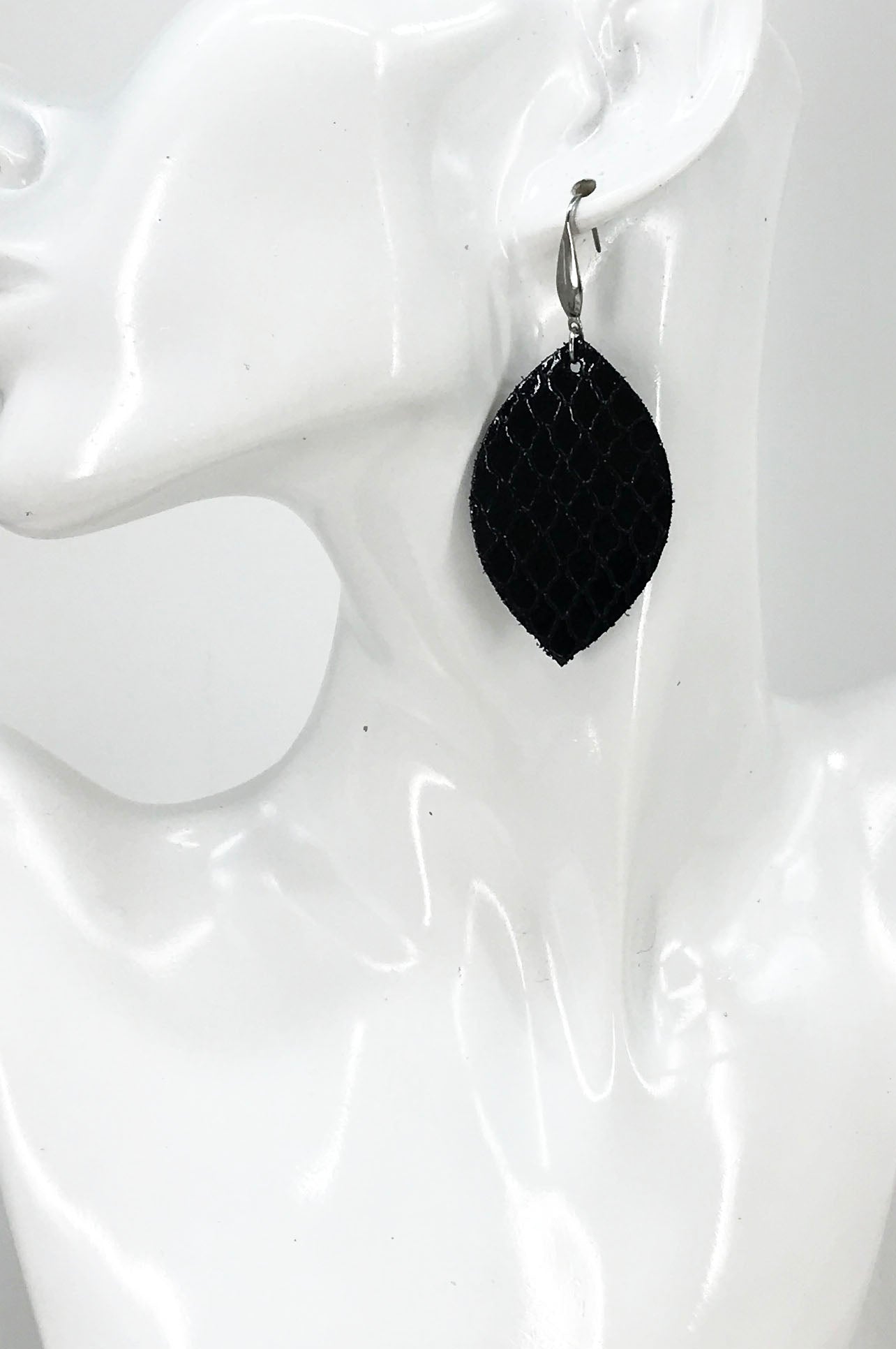 Fish Net Pattern Black Leather Earrings with Stainless Steel Findings and Ear Wires.