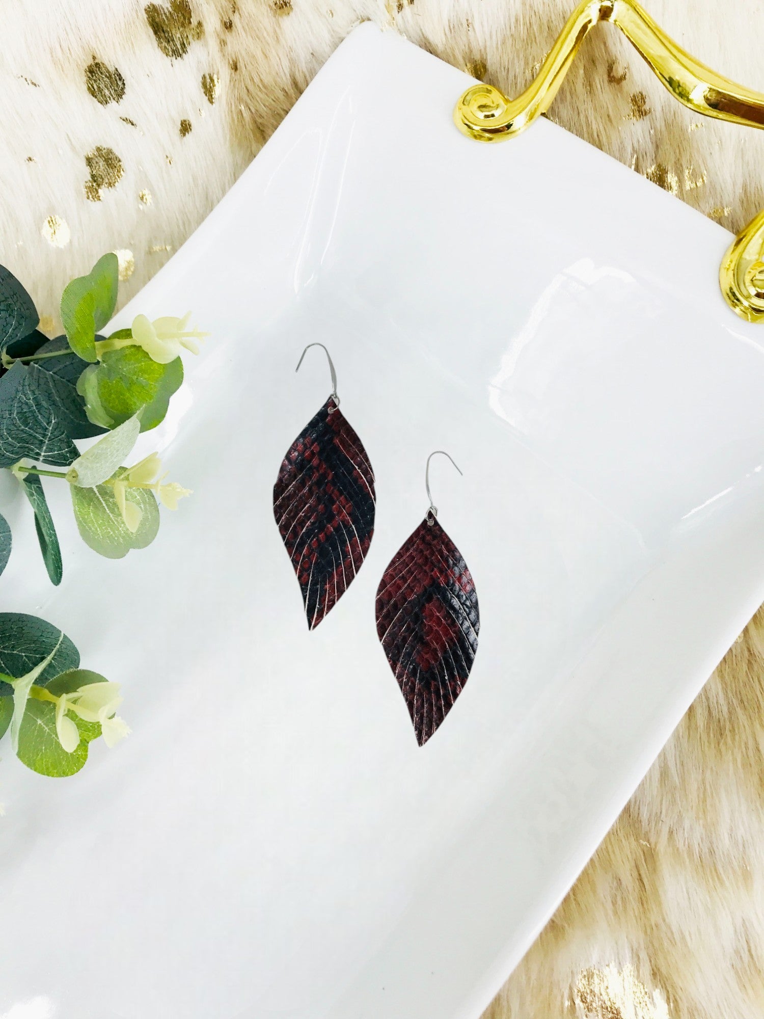 Red and Black Fringe Snake Skin Leather Earrings with Stainless Steel Findings and Ear Wires.