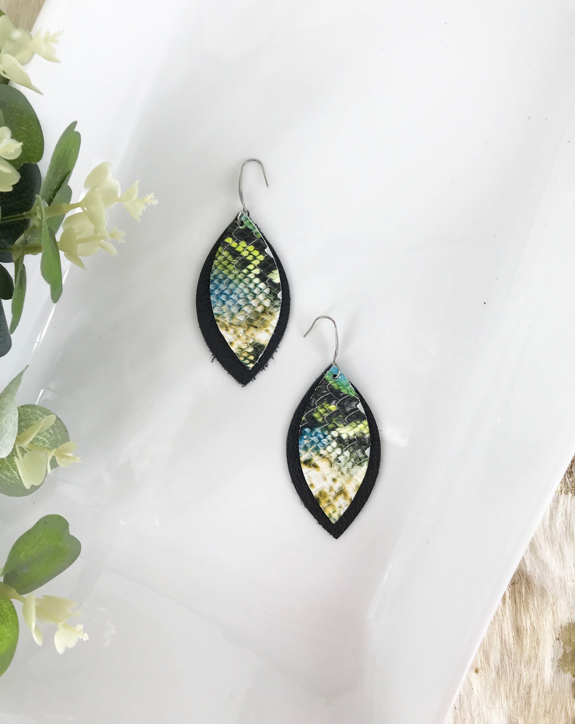Black Divine Leather and Blue and Green Cobra Leather Earrings with Stainless Steel Findings and Ear Wires.