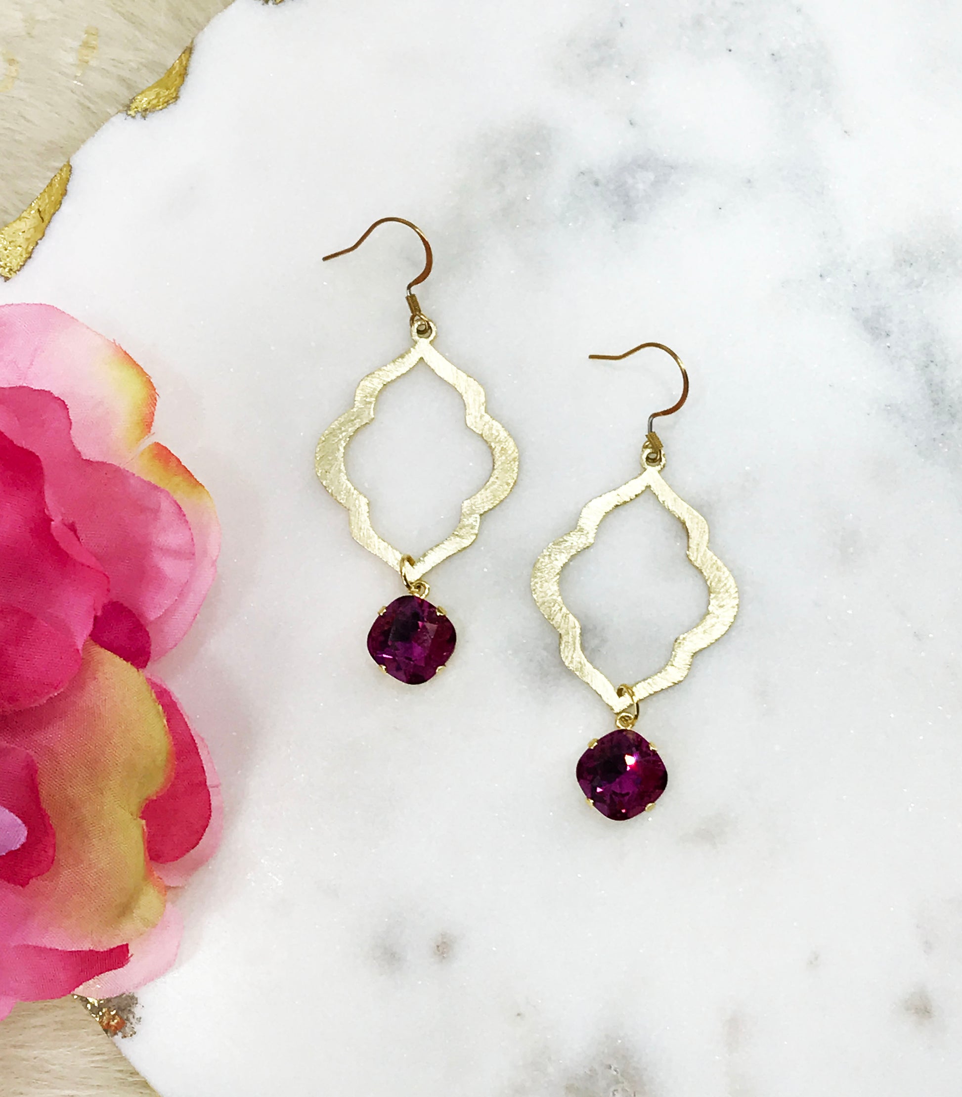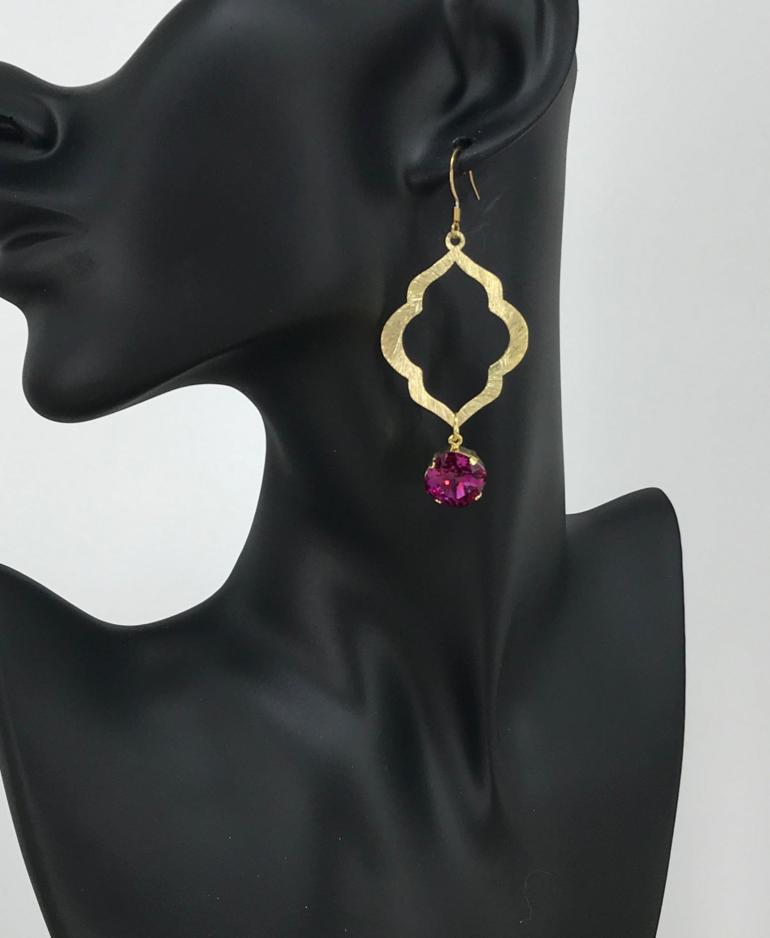 Deep Pink Cushion Cut Genuine Crystal & Large Brushed Gold Marquise Pendant Earrings on Gold Tone Stainless Steel Fish Hook Ear Wires.