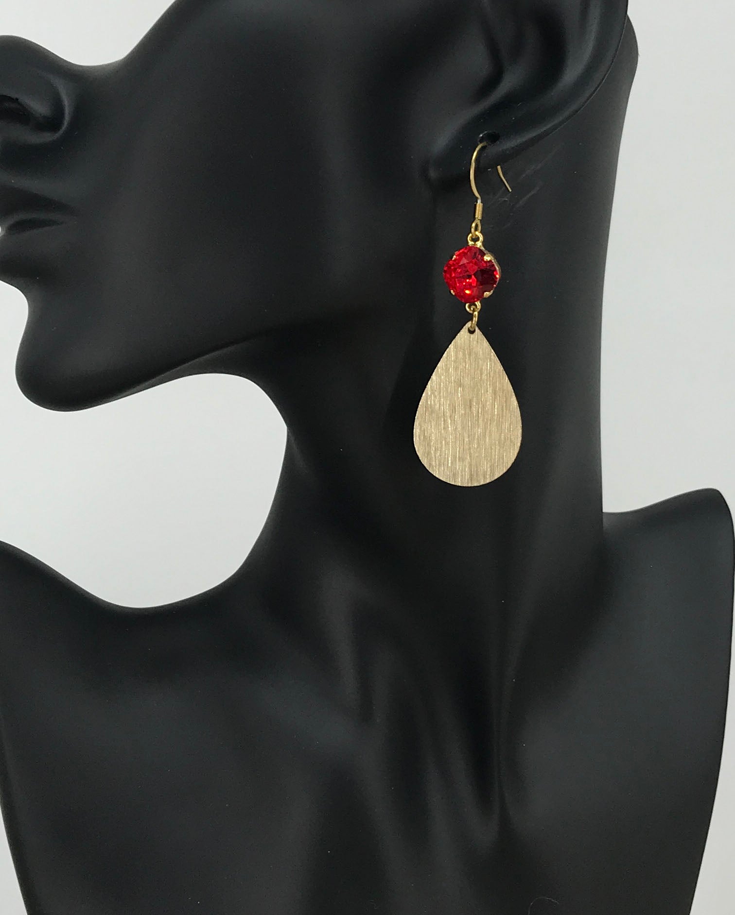 Light Siam Cushion Cut Genuine Crystal & Brushed Gold Pendant Earrings on Gold Tone Stianless Steel Fish Hook Ear Wires.