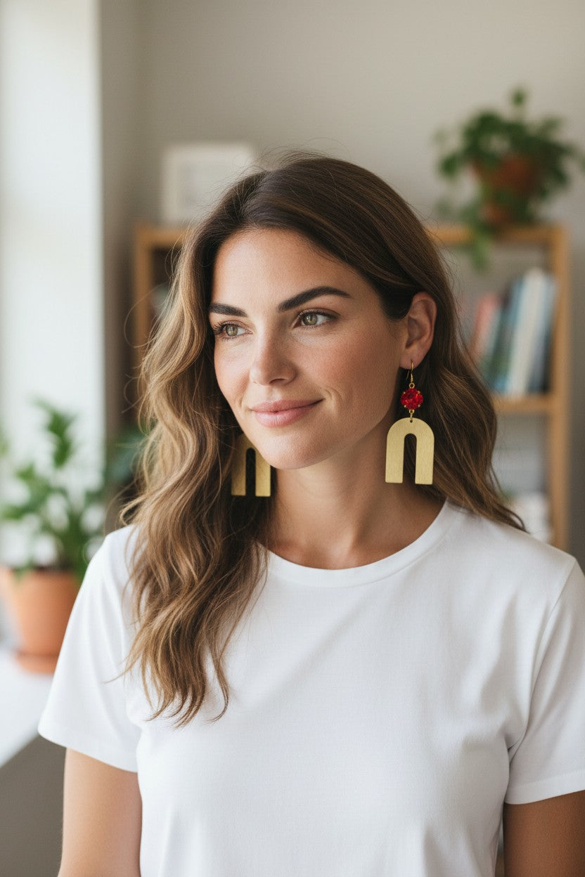 Light Siam Cushion Cut Genuine Crystal & Brushed Gold Pendant Earrings on Gold Tone Stainless Steel Fish Hook Ear Wires.