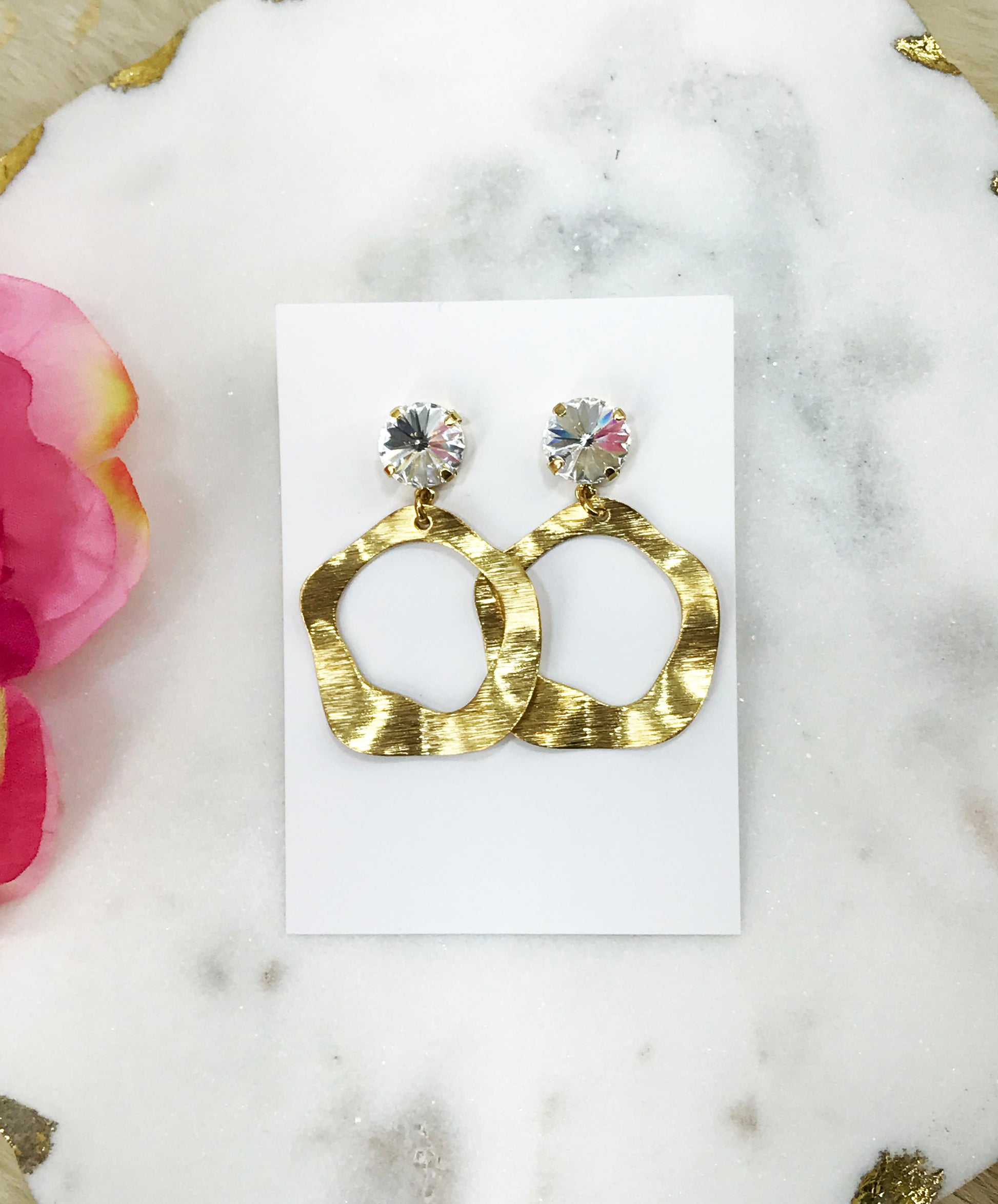 Clear Rivoli Cut Genuine Crystal & Brushed Gold Wavy Circle Pendant Stud Earrings.