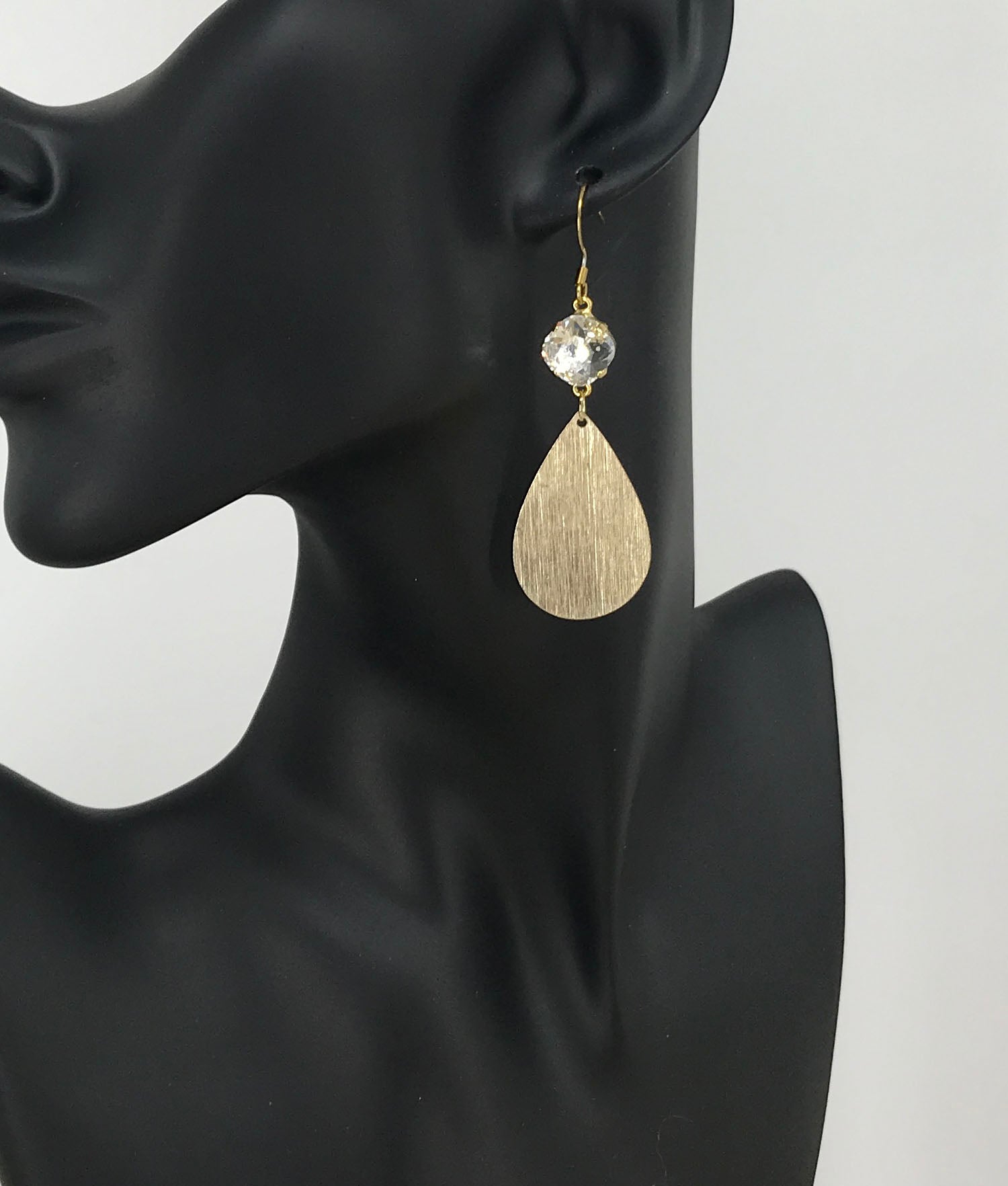 Crystal Clear Cushion Cut Genuine Crystal & Brushed Gold Teardrop Pendant Earrings on Gold Tone Stainless Steel Fish Hook Ear Wires.
