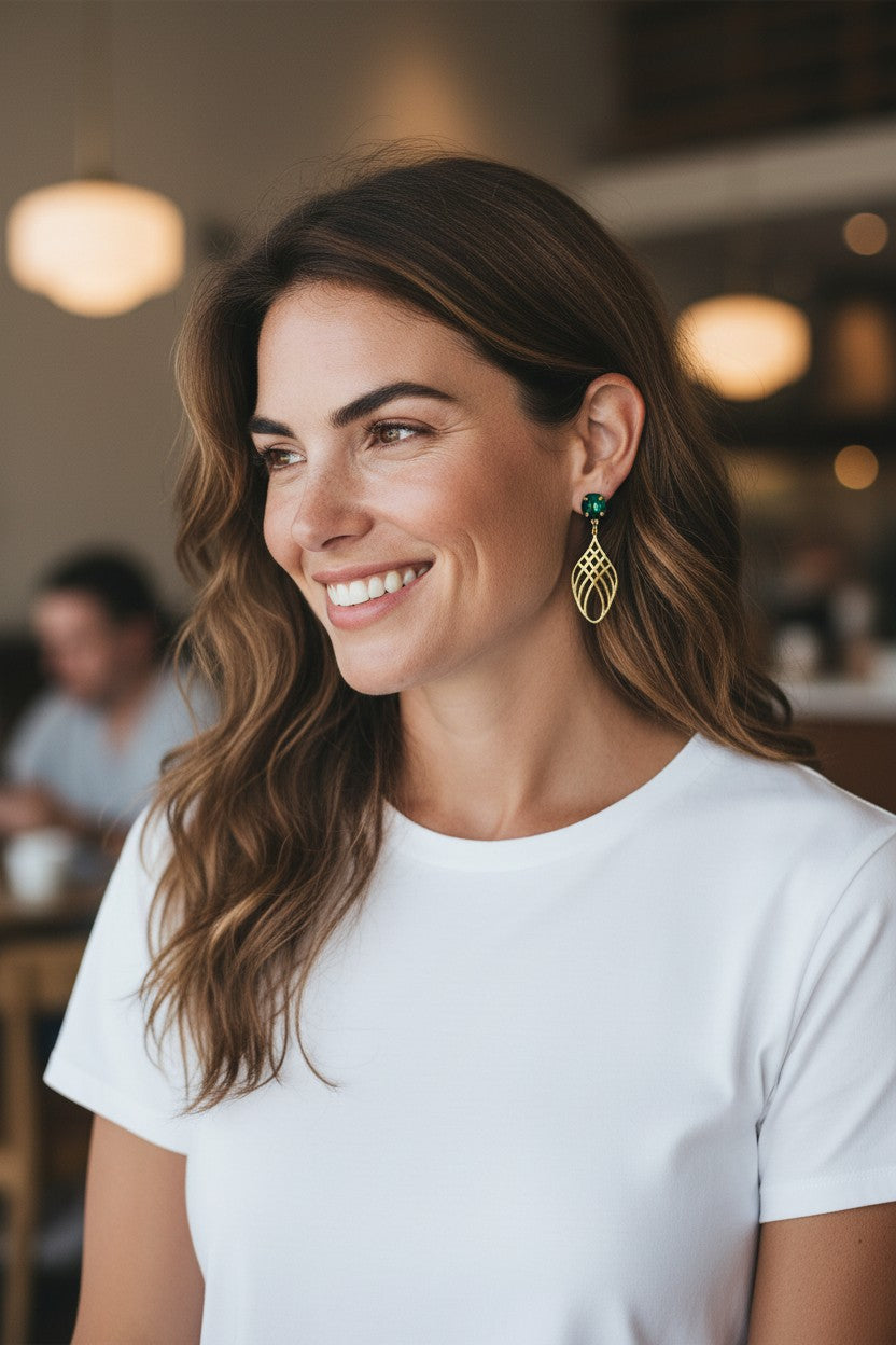 Emerald Rivoli Cut Crystal Stud and Brushed Gold Teardrop Pendant Earrings.