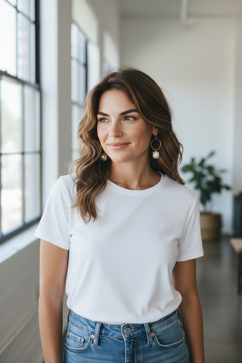 1.5" Brushed Gold Hoop & Round Rhinestone Pendant Earrings on Gold Tone Stainless Steel Fish Hook Ear Wires.