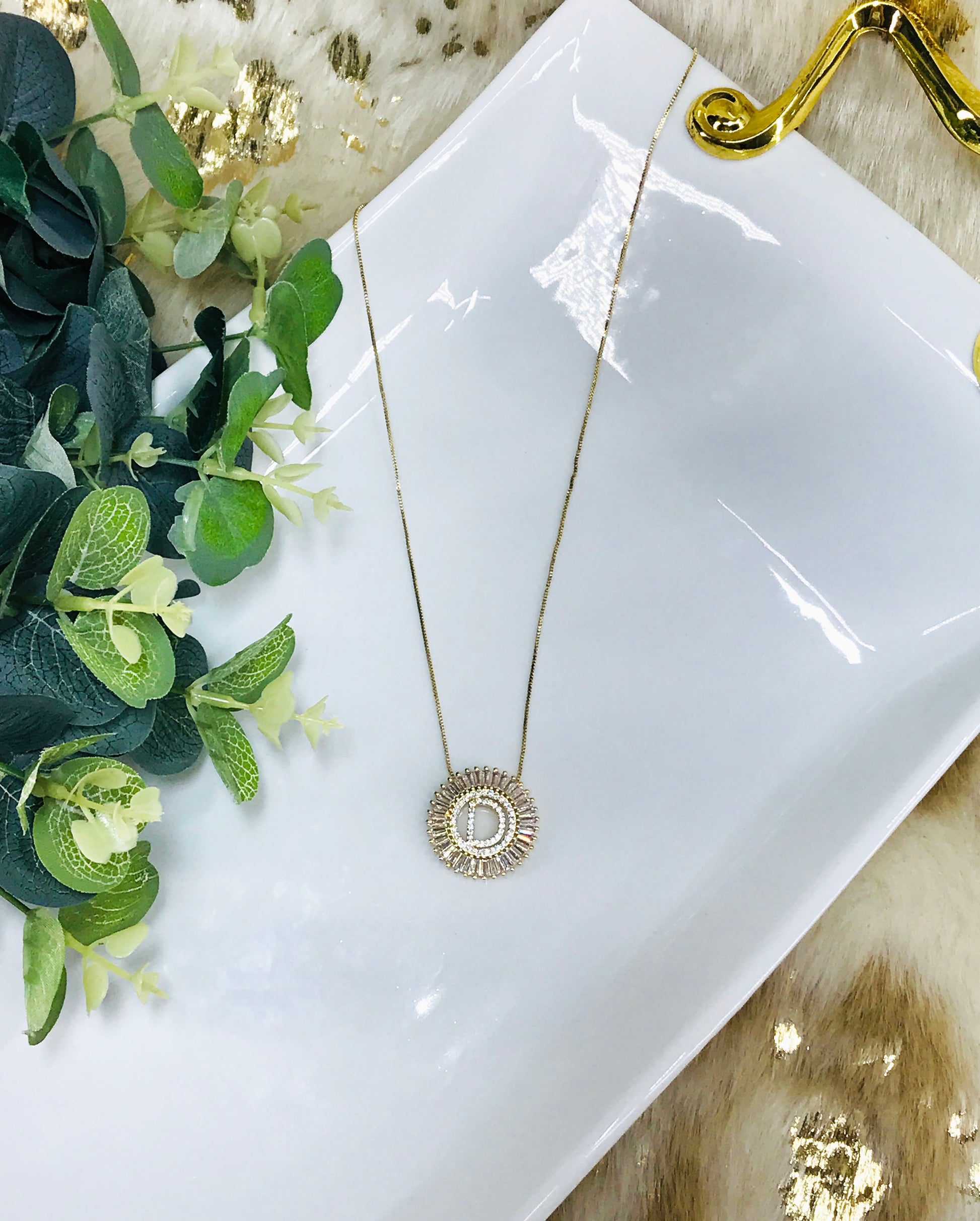 17" Clear Rhinestone Initial Necklaces in a Gold Tone Setting with Lobster Claw Clasp Closure and 2" Extender.