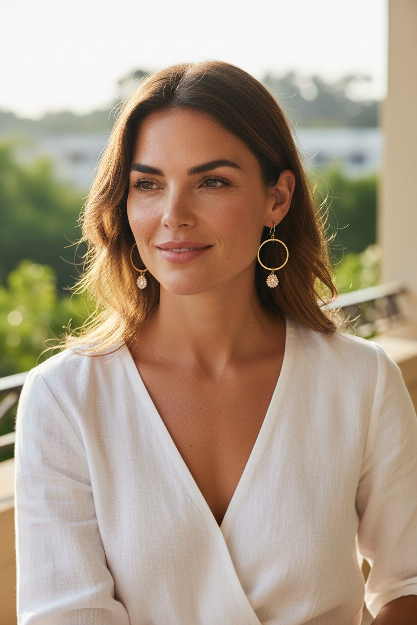 Classic hoops—upgraded. These brushed gold halo hoops are finished with a sparkling CZ teardrop charm for a soft, elegant shimmer that moves with you. Lightweight and finished with stainless steel hypoallergenic fish hook ear wires.