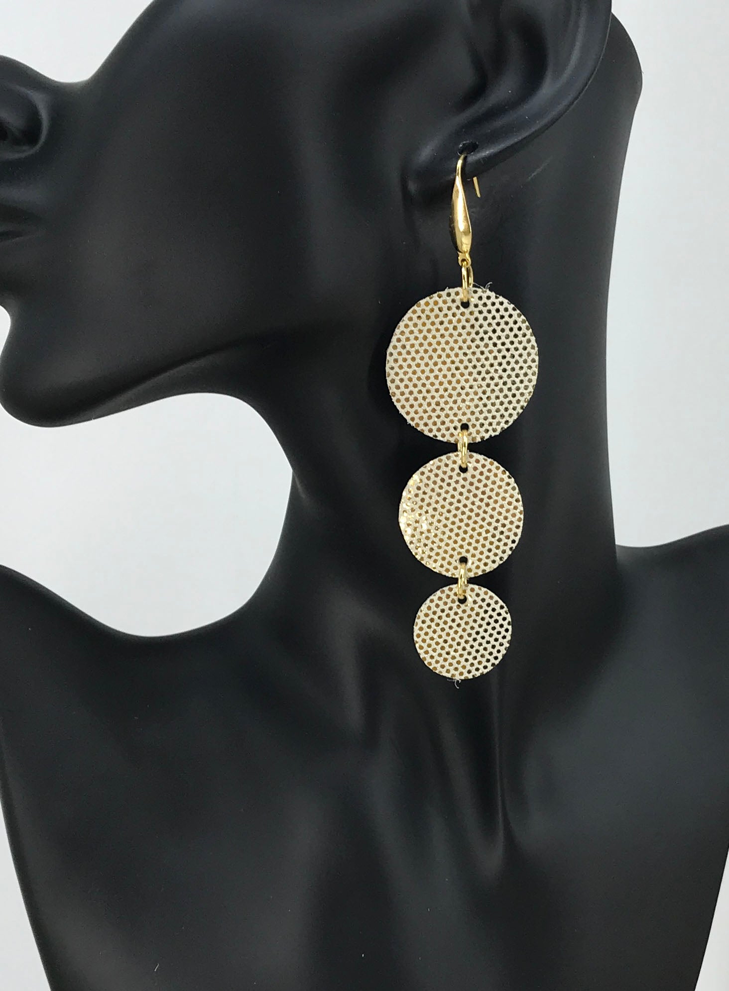 Golden Metallic Glitter on Bone Tone Leather Earrings with Gold Tone Stainless Steel Findings and Ear Wires.