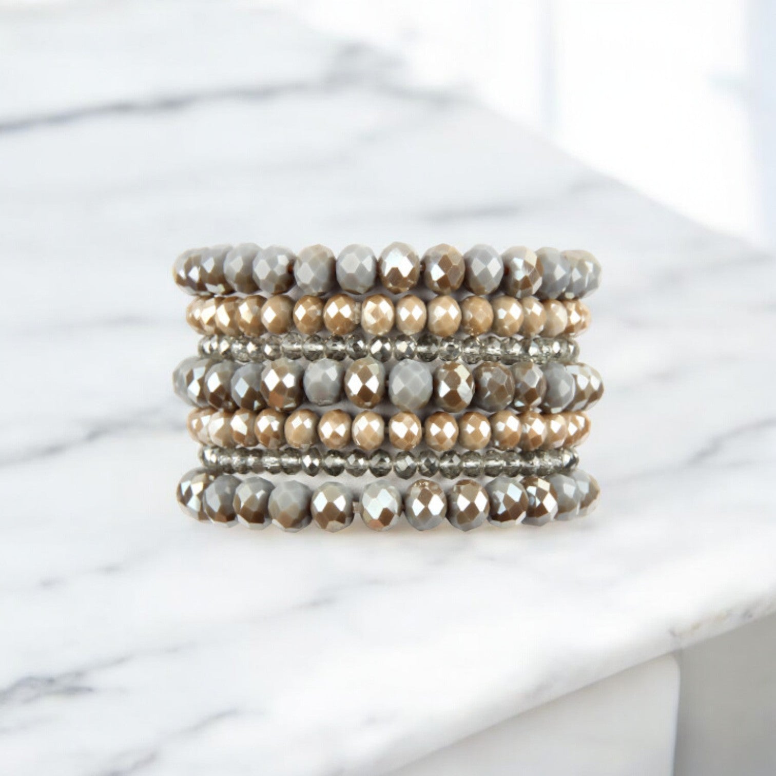 Grey Stack Bracelet Set Consisting of 7 Separate Glass Bead Stretchy Bracelets.
