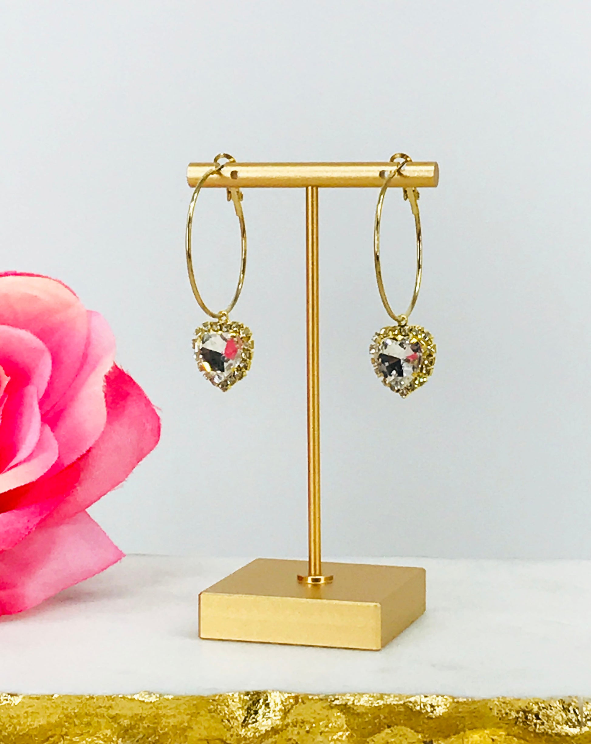 1.25" Gold Tone Stainless Steel Hoop & Glass Rhinestone Pendant Earrings. Available in Teardrop, Heart, Circle & Oval Shapes.