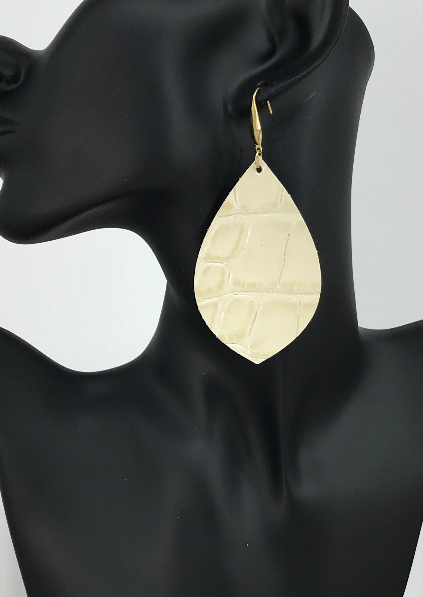 Ivory Alligator Leather Earrings with Gold Tone Stainless Steel Findings and Ear Wires.