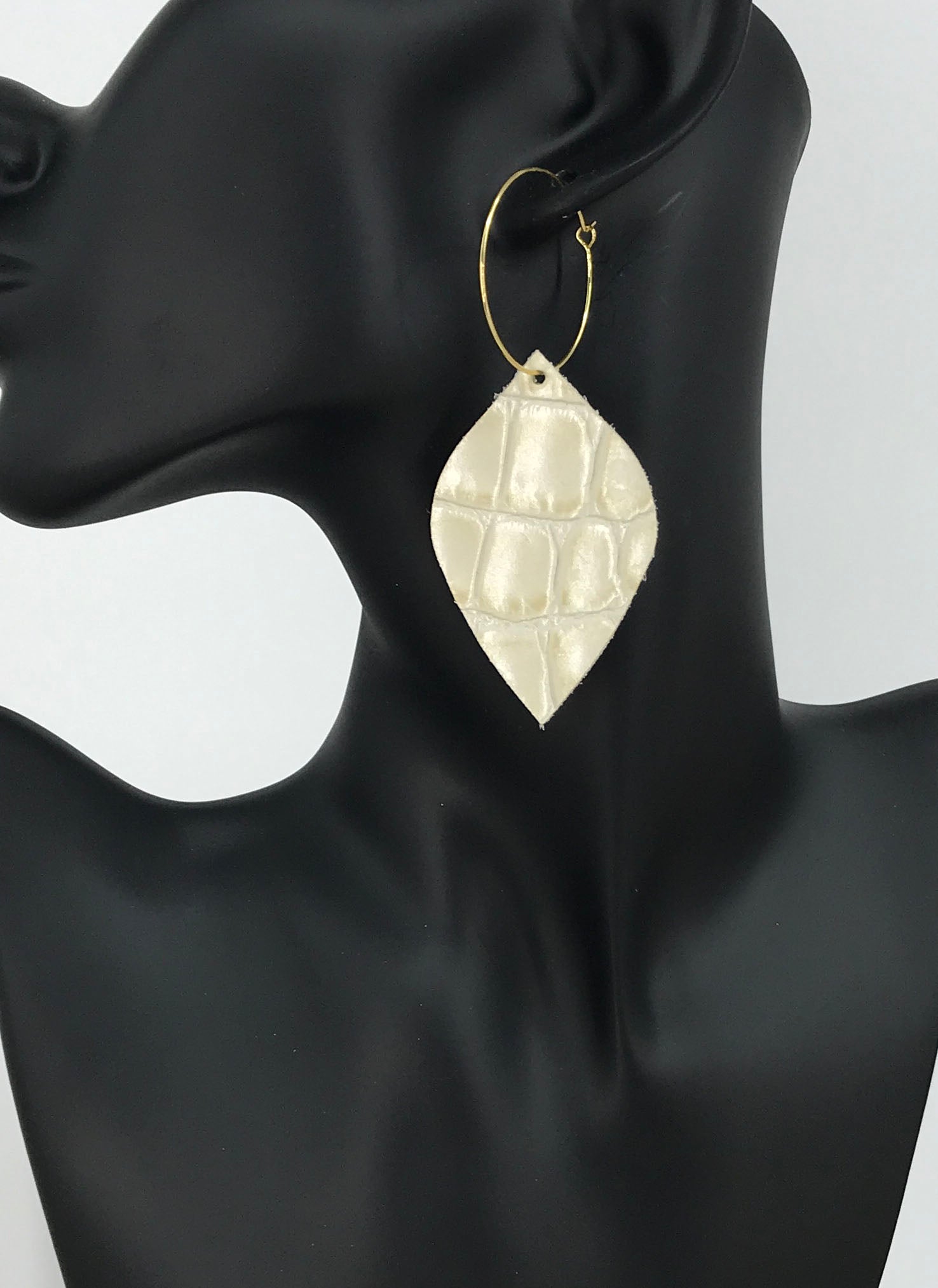 Ivory Genuine Alligator Leather Hoop Earrings on a Gold Tone Stainless Steel Hoop.