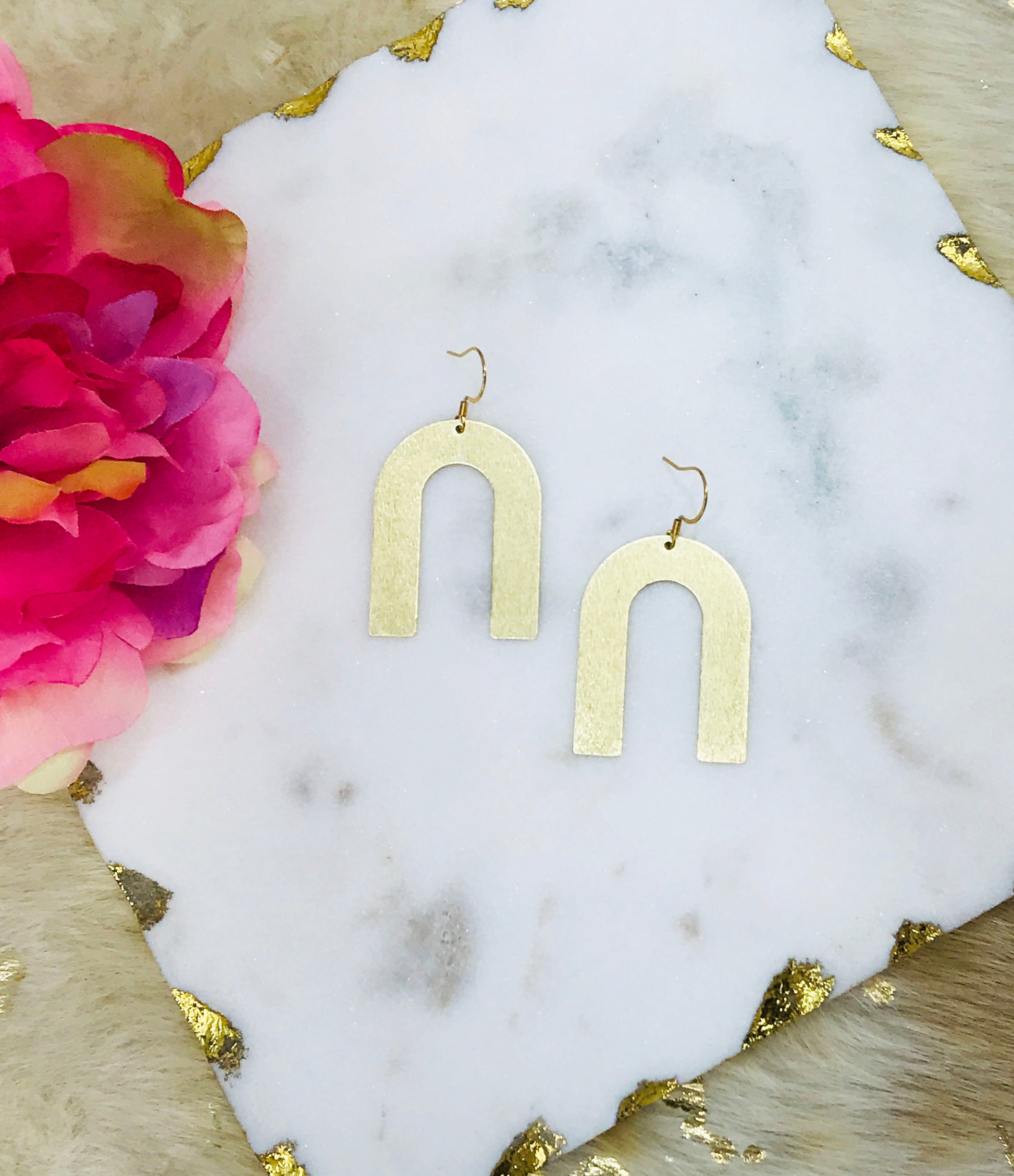 Large Brushed Gold Horseshoe Pendant Earrings on Gold Tone Stainless Steel Fish Hook Ear Wires.