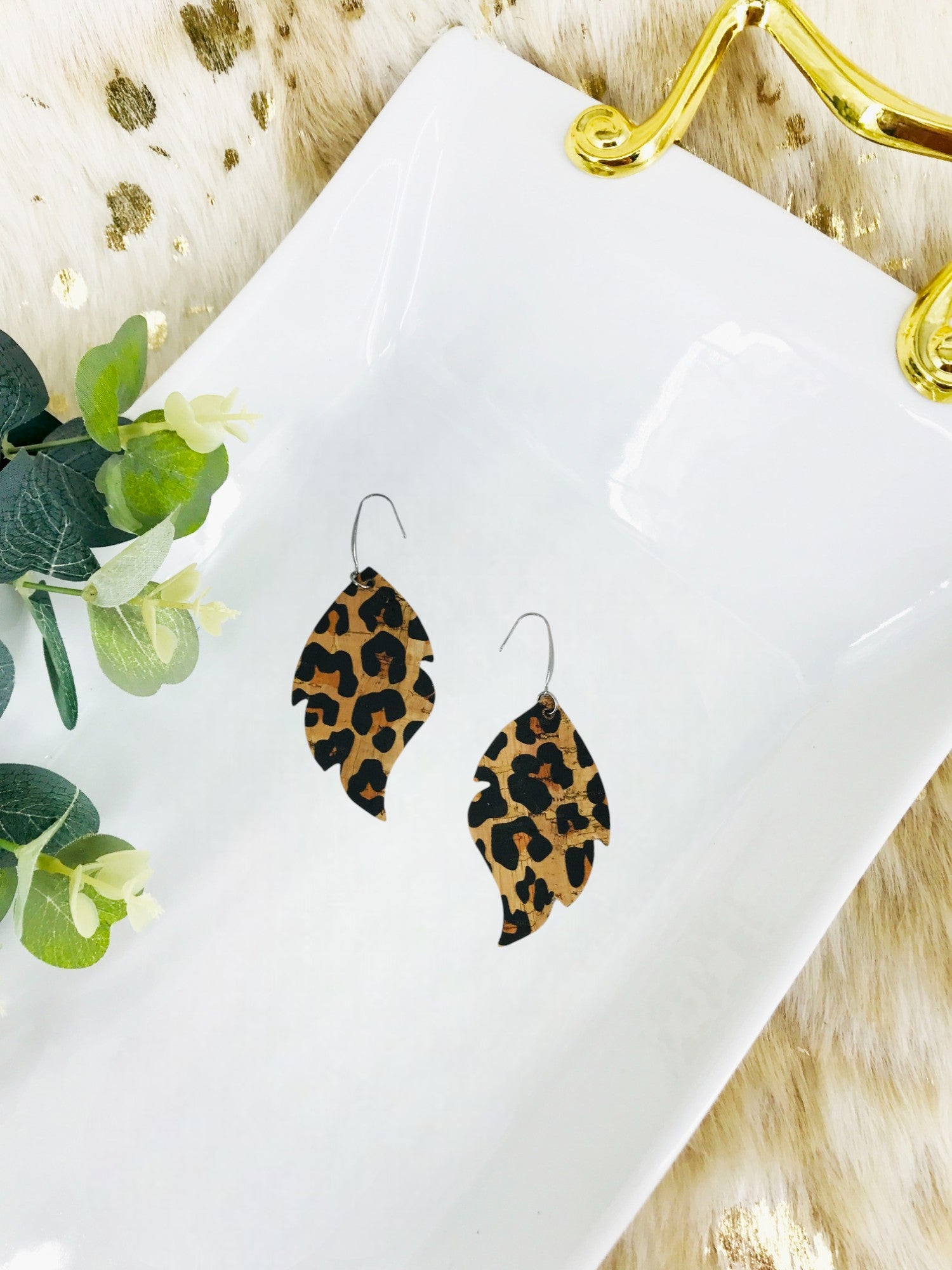 Double Sided Leopard Cork Earrings with Silver Tone Stainless Steel Findings and Ear Wires.