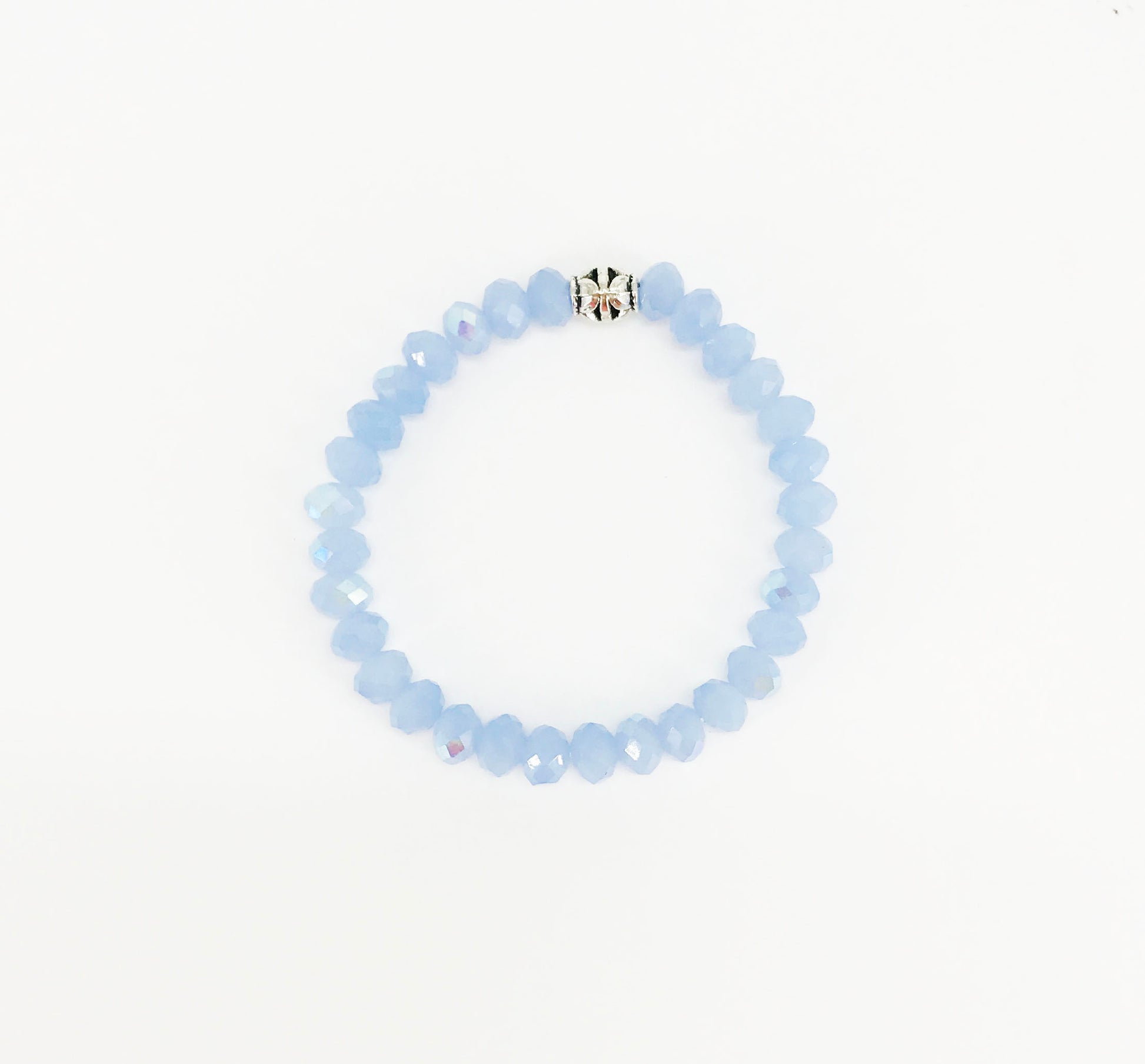8" Light Blue AB Glass Bead Stretchy Bracelet made of 10mm or 8mm Glass Beads and designed locally and hand stung on a generous length of thick stretch cord.