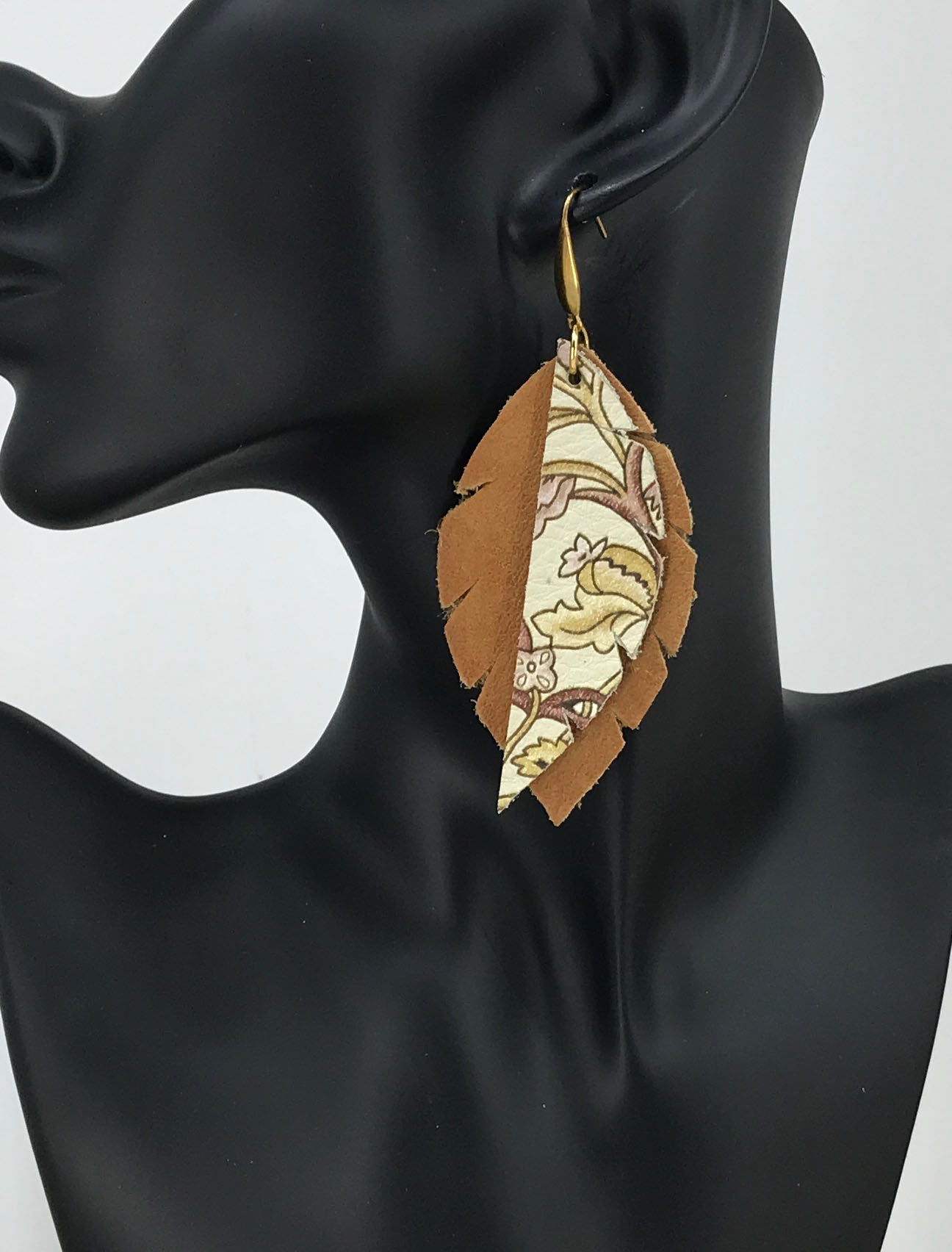 Light Brown Leather with Egg Shell Phoenix Gold Springtime Wild Flowers Leather Earrings with Stainless Steel Findings and Ear Wires.