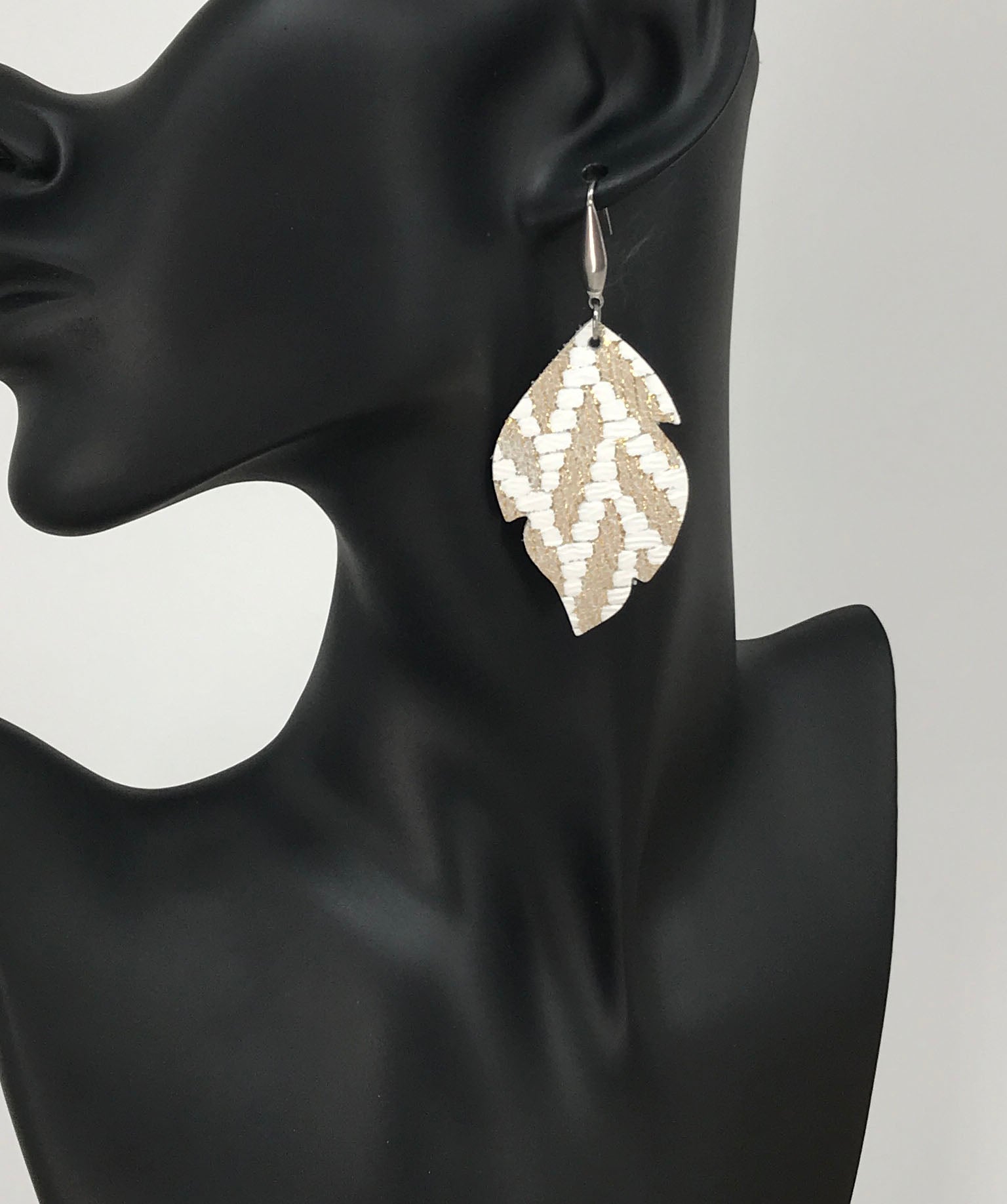 Light Gold Metallic and White Chevron Leather Earrings with Stainless Steel Findings and Ear Wires.
