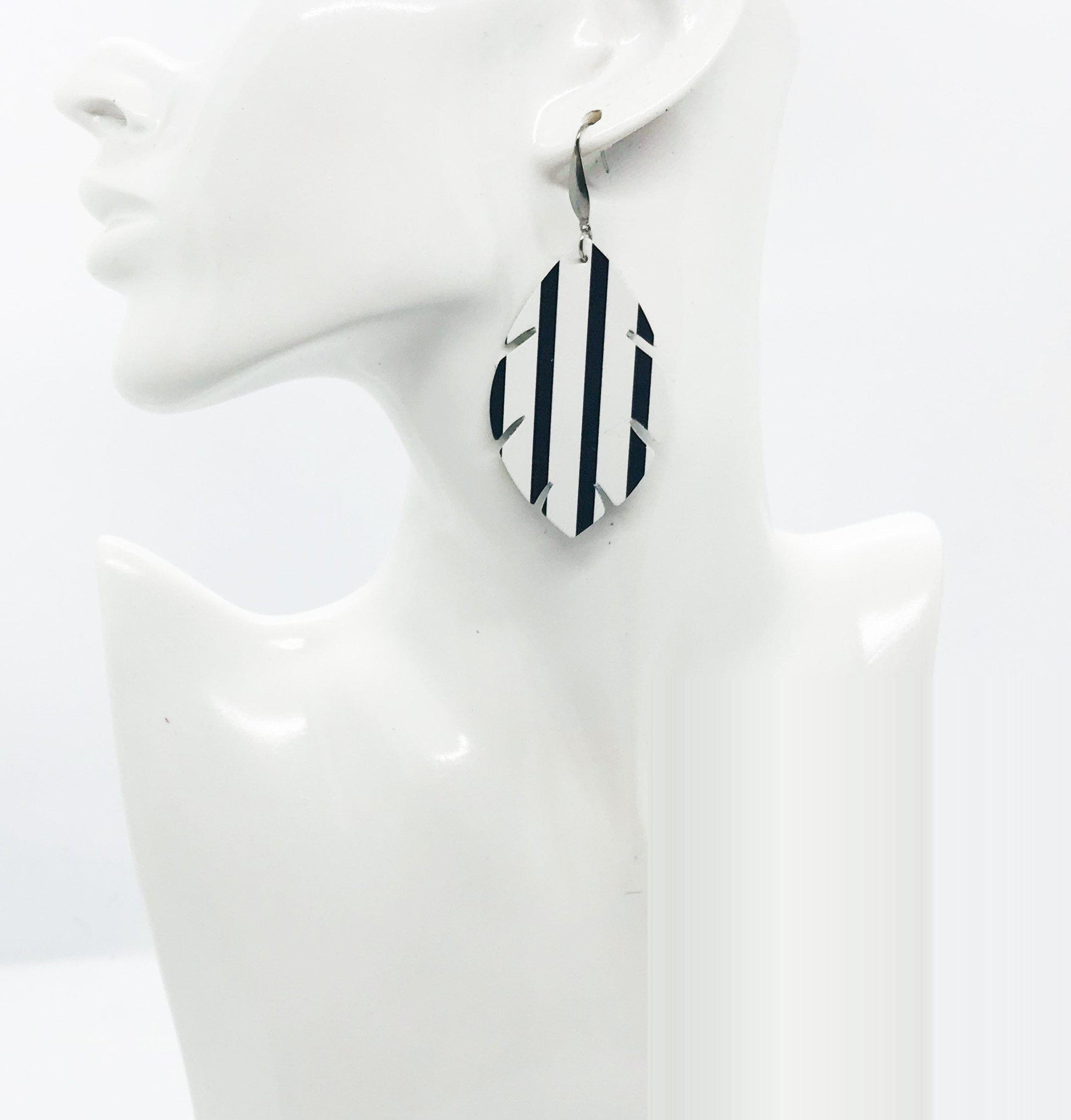 Matte Black and White Straight Striped Leather Earrings with Stainless Steel Findings and Ear Wires.