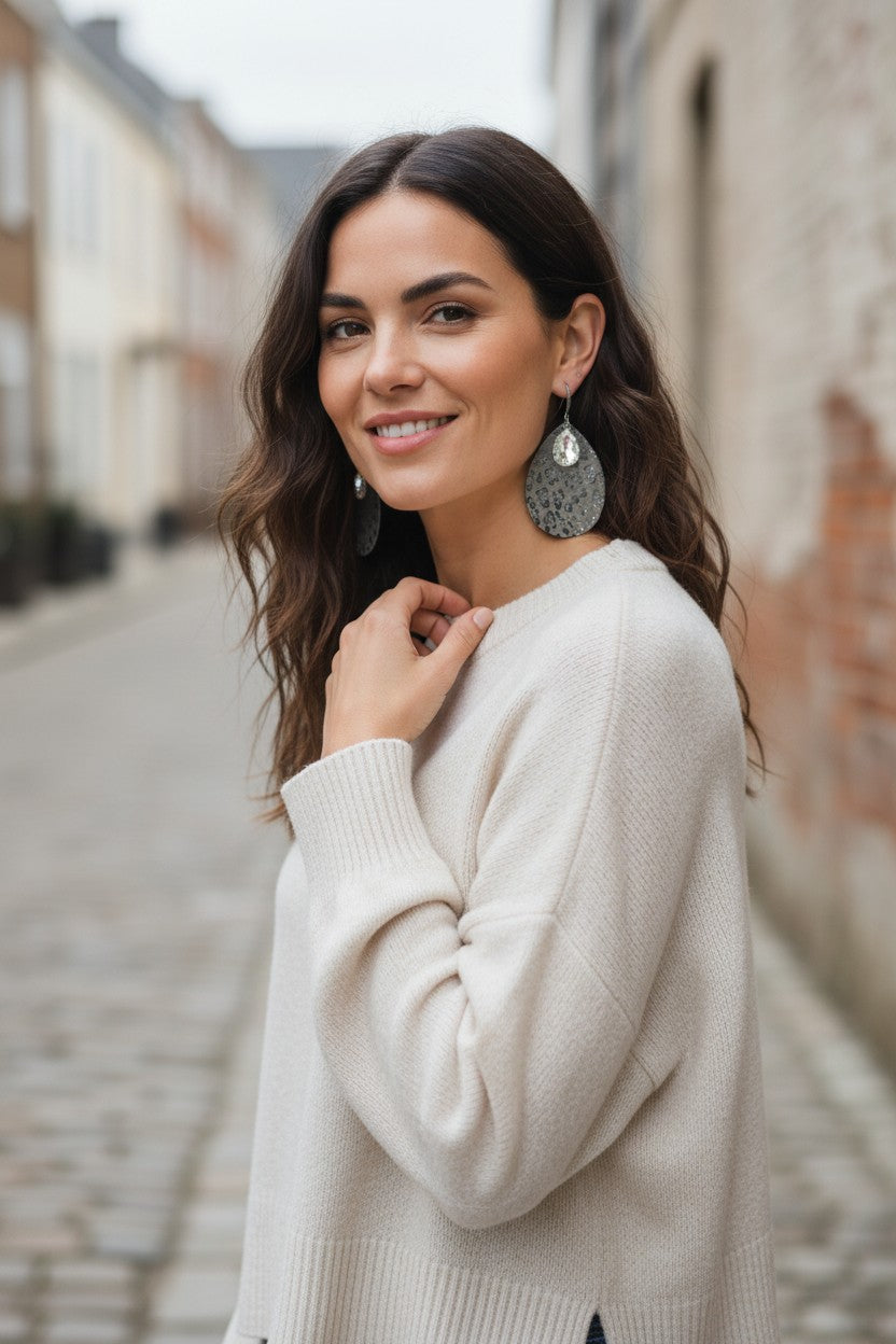Gray Metallic Glitter Leopard Leather and Clear Teardrop Rhinestone Earrings with Silver Tone Stainless Steel Findings and Ear Wires.