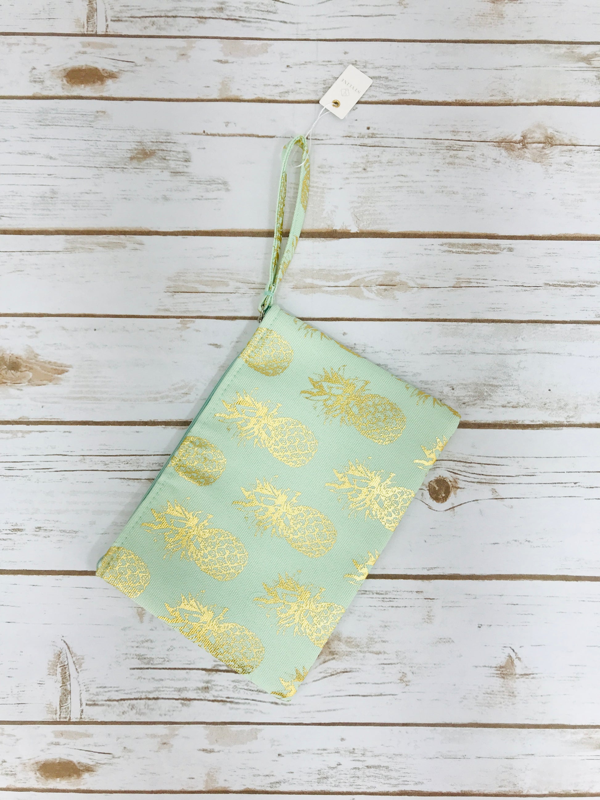 This gold foil pineapple print pouch is great for travel. Throw it in your beach bag, your luggage, or just keep it in the car to hold your essential items. It is super lightweight and has a top zipper closure with loop. The inside is completely lined. It has a smooth polyester beach bag feel.