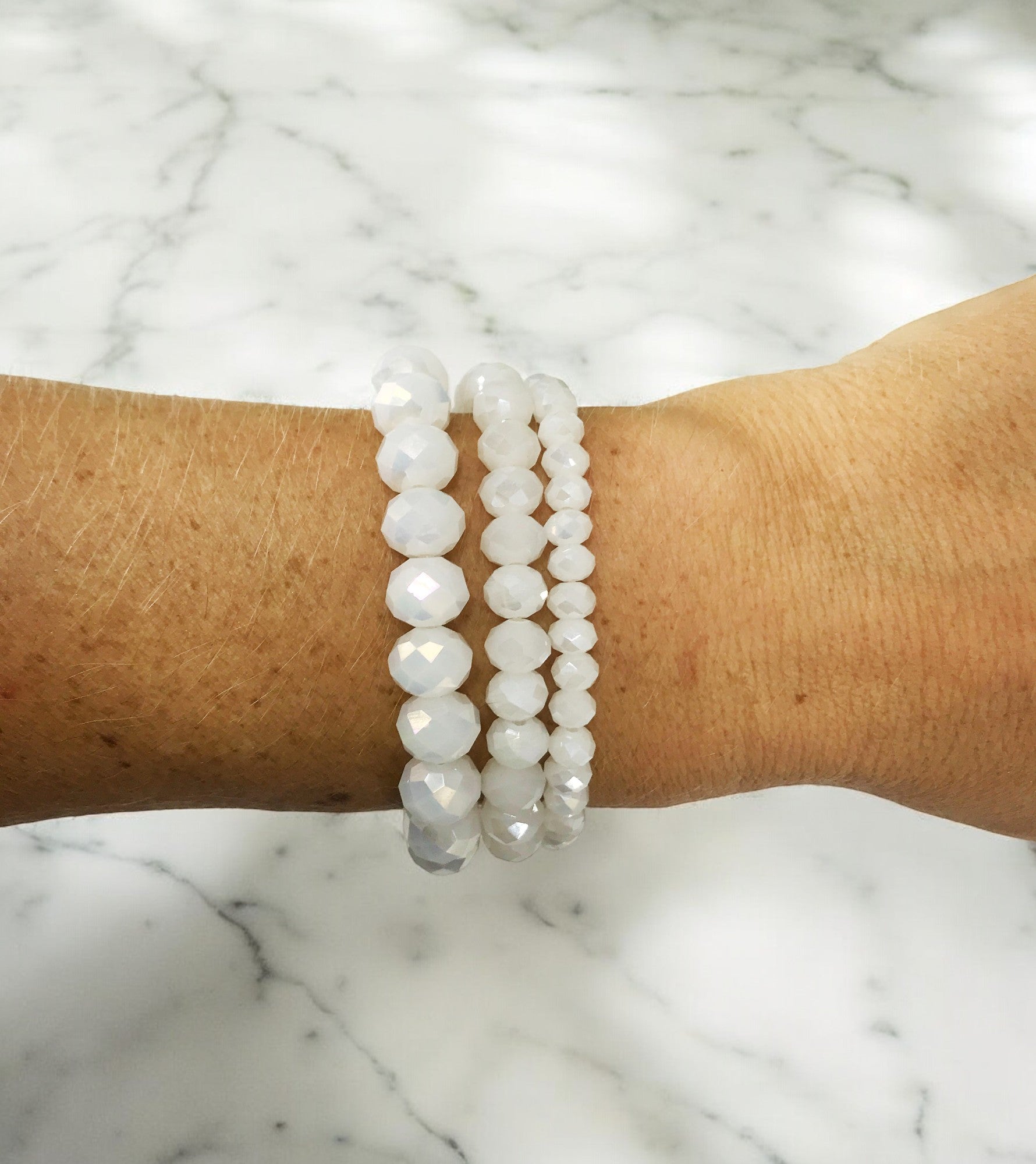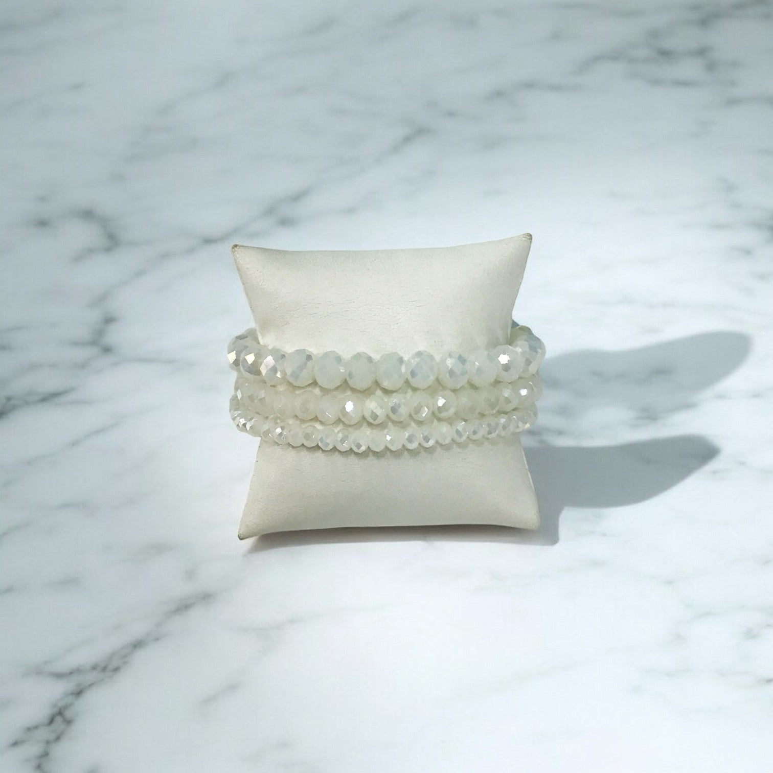 White AB Three Strand Connected Glass Bead Stretchy Bracelet.